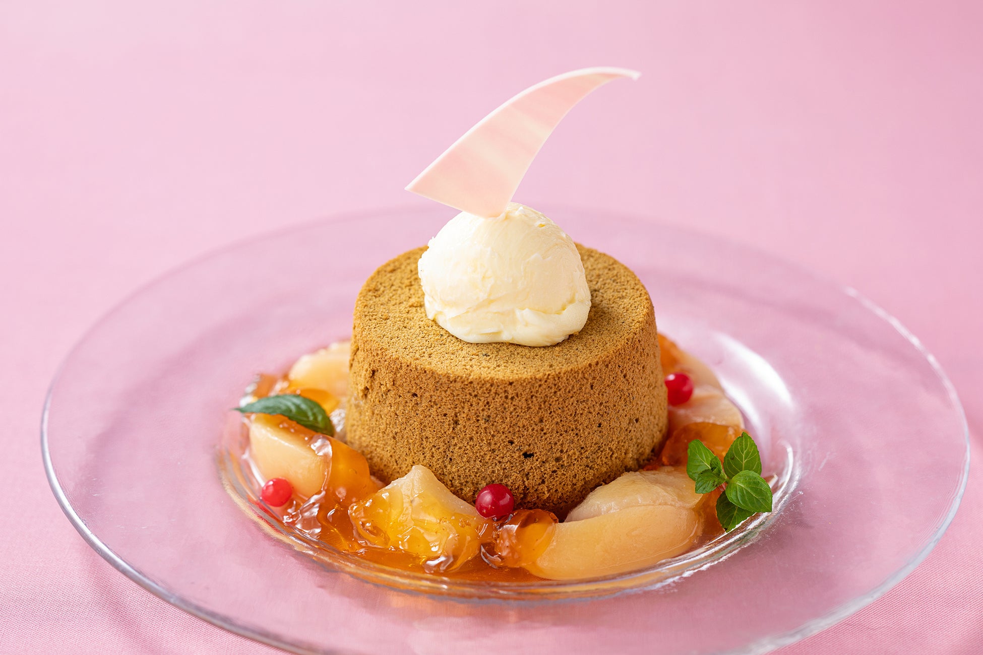 フルーティーなピーチソースを閉じ込めたふわふわ食感の“桃のシフォンケーキ”は、トップのバニラアイスクリームと周りに飾り付けたフレッシュピーチ、ベルガモットピーチティージュレと一緒に食べ進めると、いつのまにか食べ終わってしまう軽さも魅力です。