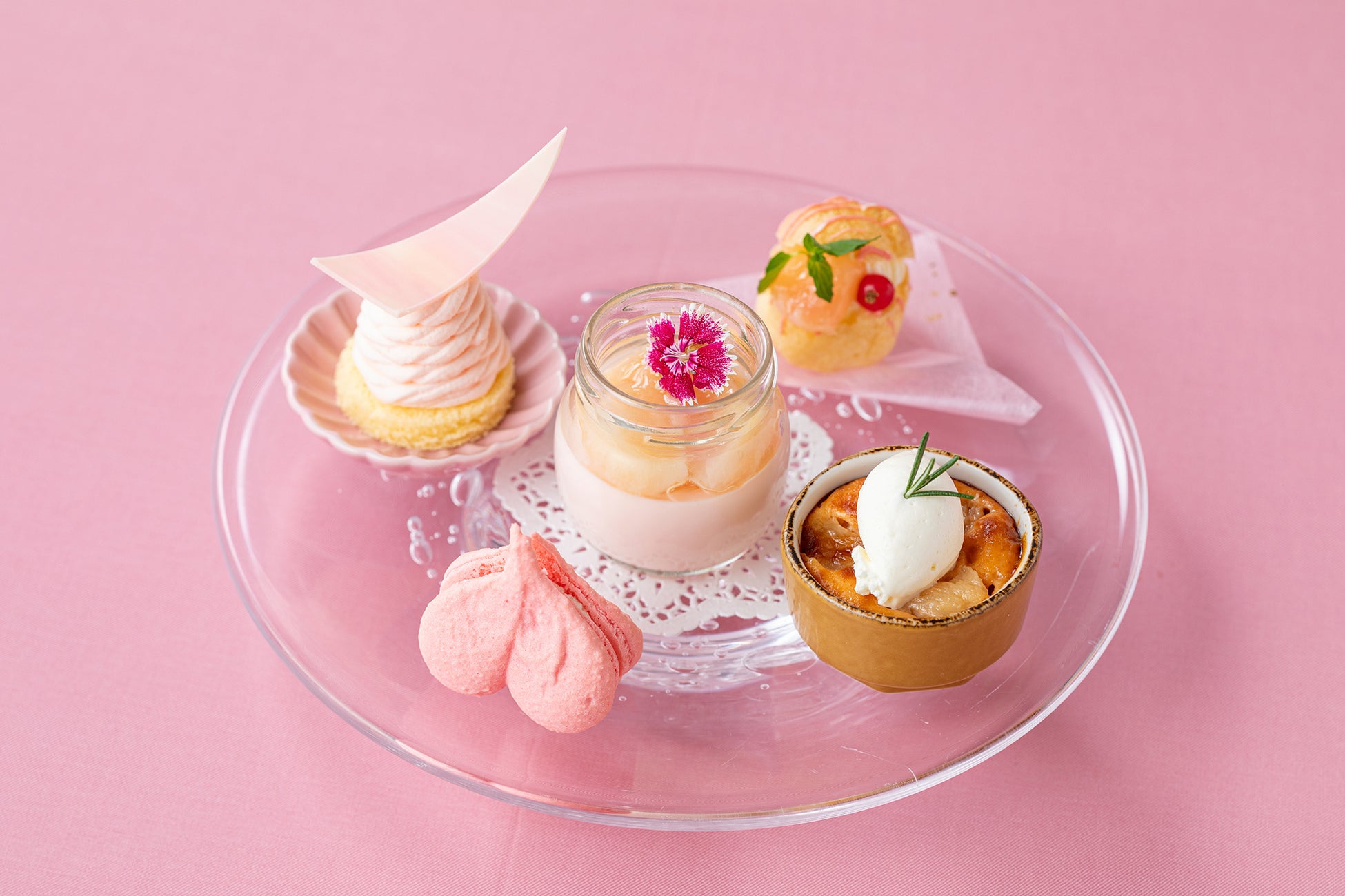 一皿で5種類のピーチスイーツが楽しめるアソーテッドスイーツ。