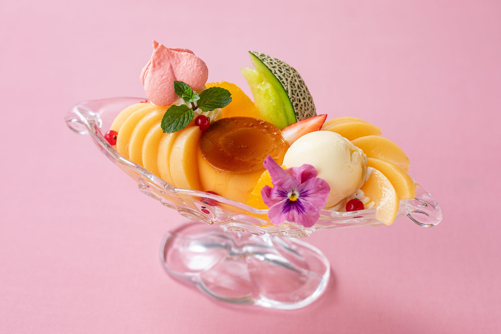 牛乳と全卵で作った昔ながらの固めで優しい味わいのプリンに、贅沢なフレッシュピーチを飾った“ピーチのプリン・ア・ラ・モード”は、桃のフォルムがかわいいマカロンとともに。