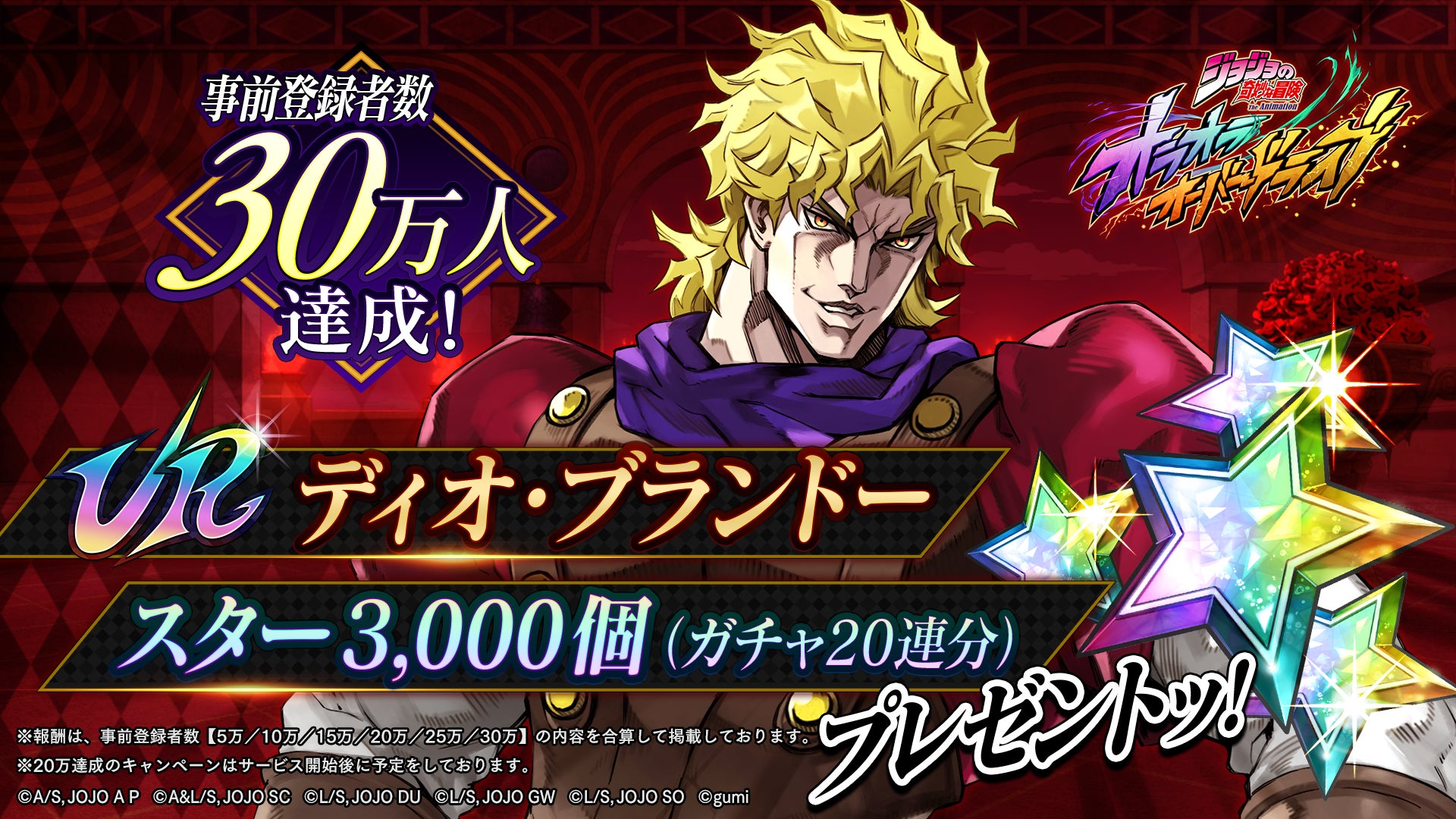 この度、本作の事前登録者数が30万人を突破いたしました。これを記念し、URユニット「【悪の帝王】ディオ・ブランドー」の配布が決定しました。これまでの達成報酬として既に配布が決定しているガチャ20連分相当のアイテムなど、ゲームをよりお楽しみいただける豪華特典をご用意しております。
