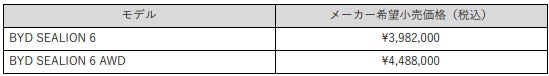 「BYD SEALION 6」は、前輪駆動の「BYD SEALION 6」と四輪駆動の「BYD SEALION 6 AWD」の2グレード展開です。全国メーカー希望小売価格は、BYD SEALION 6が398.2万円(税込)、BYD SEALION 6 AWDが448.8万円(税込)です。