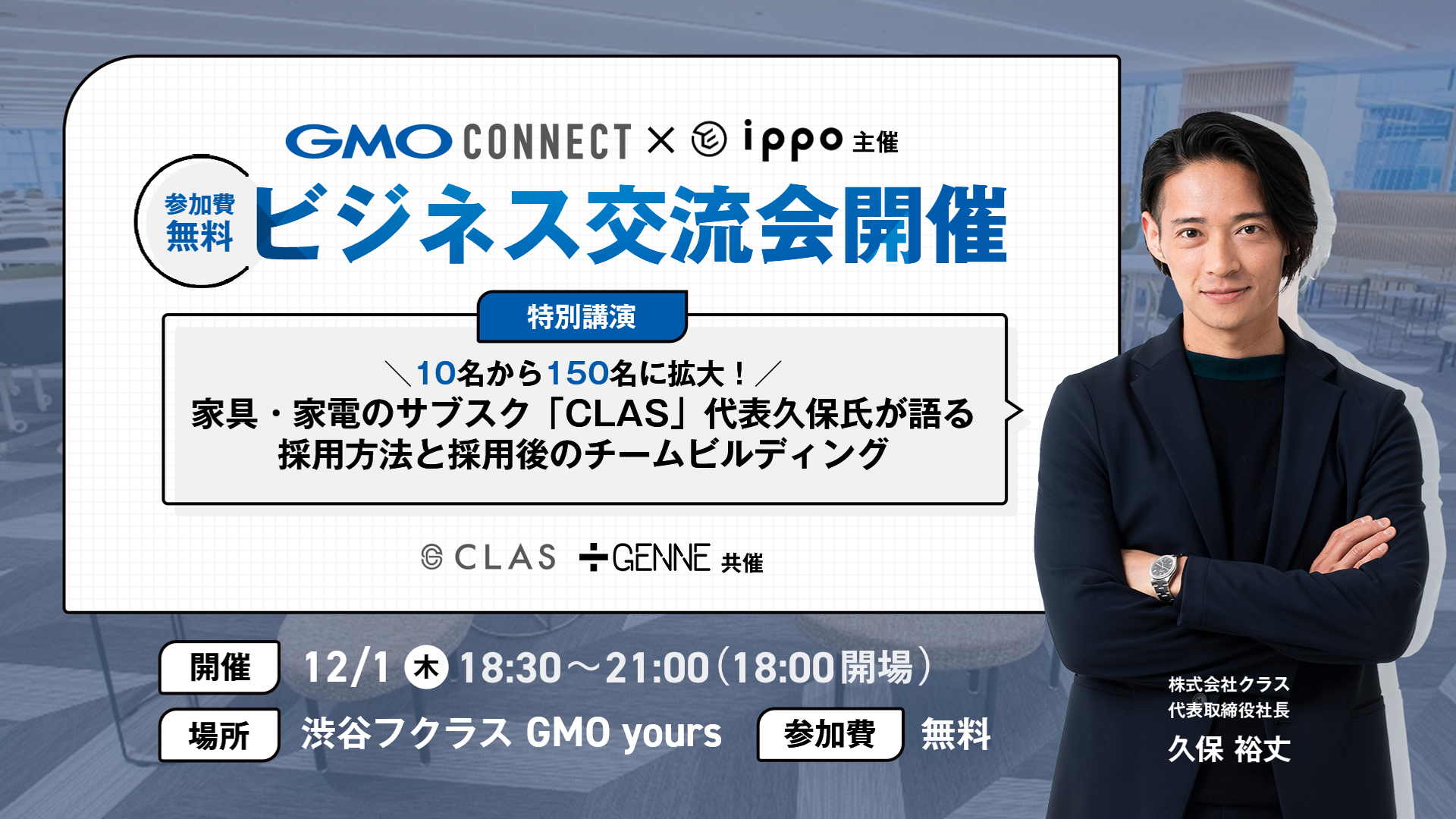 スタートアップ・ベンチャー企業に特化したオフィス仲介業務と不動産サービスを展開する株式会社IPPO(東京都渋谷区 代表取締役社長:関口秀人 以下IPPO)は、2022年12月1日(木)に『\10名から150名に拡大!/家具・家電サブスク「CLAS」代表久保氏が語る 採用方法と採用後のチームビルディング』としてGENNE株式会社、GMOコネクト株式会社と共催でオフラインイベントを開催します。
