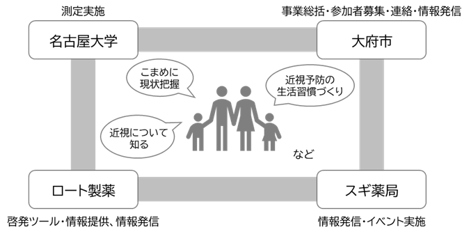 近年、子どもの近視の増加は深刻な社会課題となっています。近視になるのが早いほど、将来近視が強くなる傾向にあり※1、近視が強いほど将来失明につながる眼疾患のリスクが高まる※2とも言われています。近視の増加には遺伝要因もありますが、近年の増加は屋外活動の減少、近業作業の増加、就寝時間の変化など環境要因の影響が大きいと言われています。なお、成長段階にある子どもの頃が最も近視が進みやすく、この時期の重点的な予防・対策が重要です。この度、主体的な健康づくりを推進している愛知県大府市が「健康都市おおぶ」の先駆的な取り組みとして、「大府市子どもの近視予防プロジェクト」を立ち上げ、当社は大府市、株式会社スギ薬局および名古屋大学大学院医学系研究科眼科学・感覚器障害制御学教室と協力し、子どもの近視予防のための取り組み支援や啓発活動を進めてまいります。