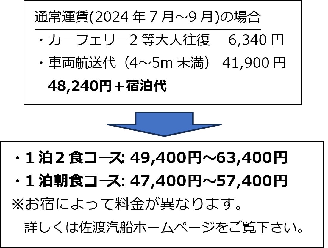 同プランは「直江津航路往復乗船代(カーフェリー2等+乗用車航送)」と「宿泊代」がセットになった宿泊プランです。旅行の荷物がたくさんある場合でも、マイカーで自由に島内を移動できます。