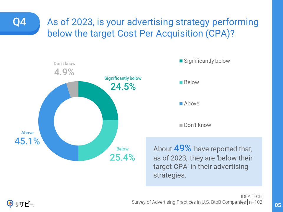 Firstly, we found that BtoB advertising professionals predominantly employ social media advertising (59.8%) and display advertising (53.9%) as their internet advertising strategies within their respective organizations. As of 2023, 89.2% of respondents indicated they have successfully achieved their target conversion numbers through their advertising efforts. Furthermore, as of 2023, around 49% of respondents reported that they are currently below their target CPA (Cost Per Acquisition) goals. However, when compared to previous years, CPA has been on the rise. To combat this increase in CPA, approximately half of the respondents are implementing content marketing as a countermeasure.