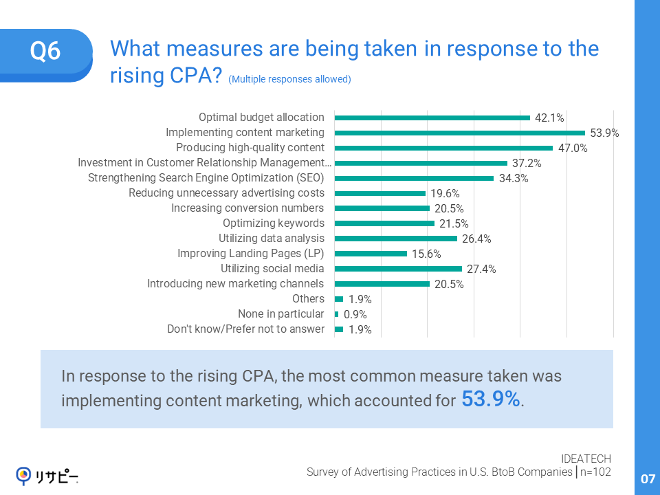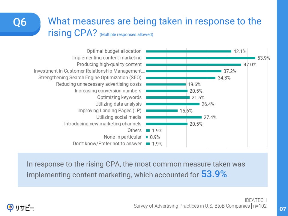 IDEATECH、米国企業BtoBの広告担当者102名に聞いた調査!広告施策におけるCPA高騰に対し、「コンテンツマーケティング」を53.9%が実施