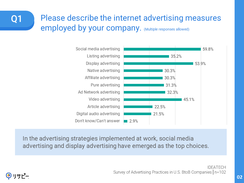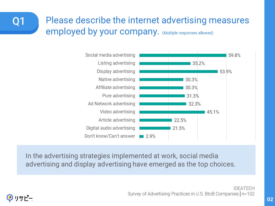 Tokyo, Japan – IDEATECH, a provider of comprehensive research data marketing services through Research+P [risəpíː](https://ideatech.jp/service/research-pr), recently conducted a survey targeting 102 advertising professionals in the BtoB industry. This survey aimed to investigate the advertising practices of U.S. BtoB companies. We are pleased to provide you with a summary of the findings in this press release.