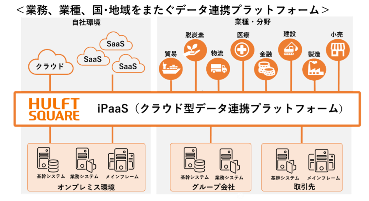 HULFT Squareは、DX実現に必要な「データ活用するためのデータ準備」や「業務システムをつなぐデータ連携」を支援する日本発iPaaS(クラウド型データ連携プラットフォーム)です。オンプレミス・クラウド・SaaSなどの環境に分散し管理されているさまざまなデータを、業務システム間、業種、国・地域をまたぎデータを連携させることができます。