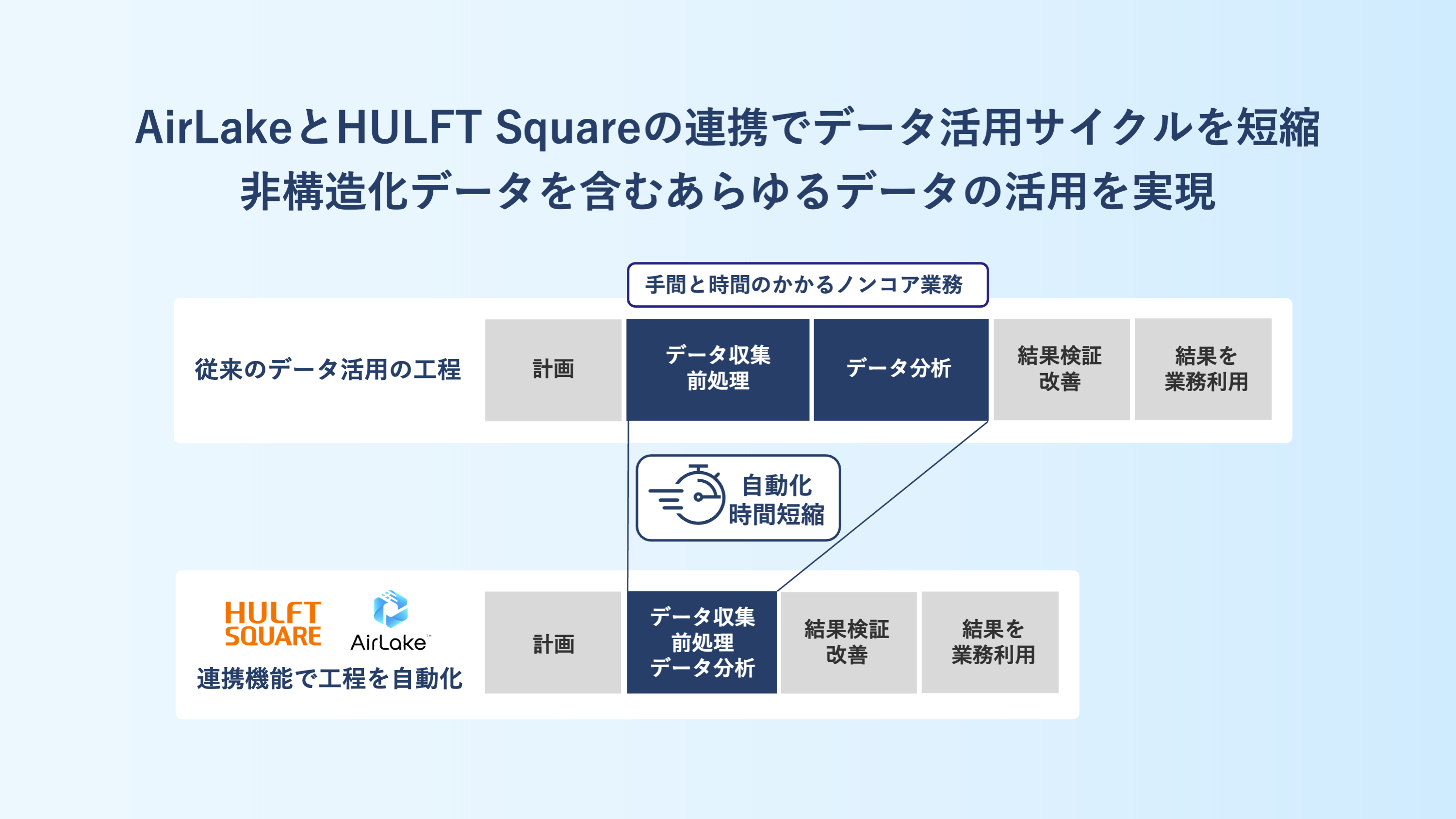 「AirLake」と「HULFT Square」を連携することにより、多くの企業が十分に活用できていないデータ活用に要する手間と時間が省力化されることで、「社内情報をダッシュボードで共有したい」といった判断に必要なデータ活用のアウトプットを迅速に得られ、意思決定までのサイクルを短縮することが可能となります。