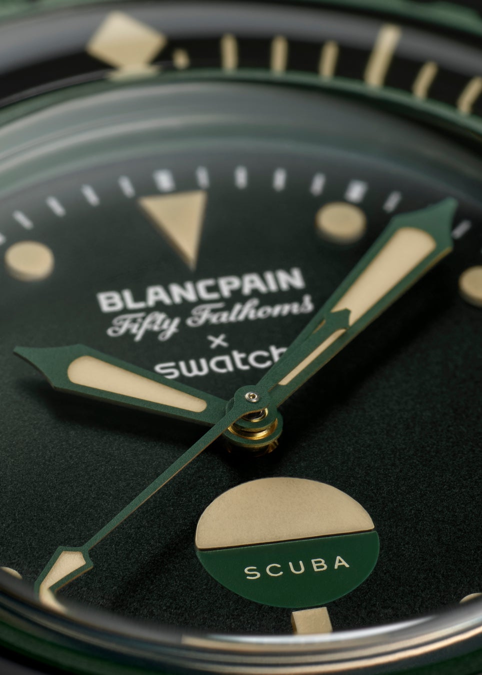 GREEN ABYSSの文字盤にはブランパンのヴィンテージロゴが配され、コレクターの間で人気の高いディテールとなっています。また、文字盤とクラウンにはブランパンとSwatchのコラボレーションを称えるロゴがあしらわれ、NATOスタイルの2ピースのストラップ、そしてFifty Fathomsのアイコニックなシルエットを想起させるケースの輪郭は、その不朽のレガシーを反映しています。