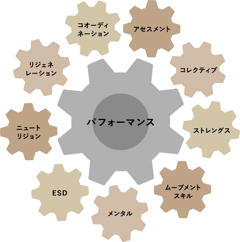 パフォーマンスアップのためには、「バランスの取れたギアの回転」が重要だとPCPは考えています。トップアスリートはもちろん、パフォーマンスアップを目指すすべての方に個別性の高いトレーニングを提供するために PCPシステムを構築しました。PCPシステムは、「パフォーマンスアップ・トレーニング」と「運動×栄養×休養」によって、「最短で最大の効果」を発揮できるよう体系化しています。