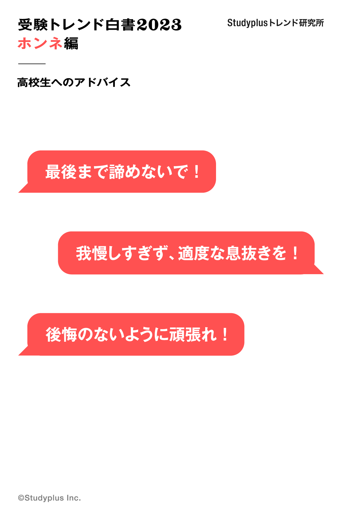 「今しか出来ないことだと思うので、後悔がないようにしてください!推し活とかSNSは無理に我慢することはないと思います。それを励みに頑張れるようにすれば大丈夫です。自分のペースで目標に向けて頑張ってください!」