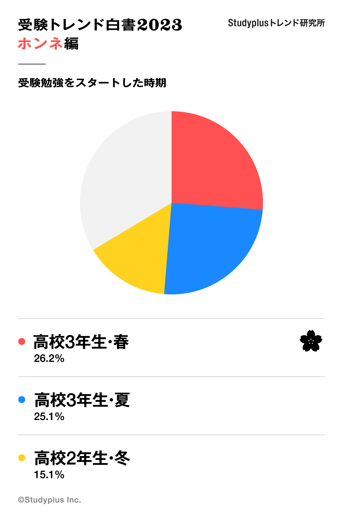 受験勉強のスタート時期は、「高校3年生・春」が最も多く26.2%、続いて「高校3年生・夏」が25.1%となりました。