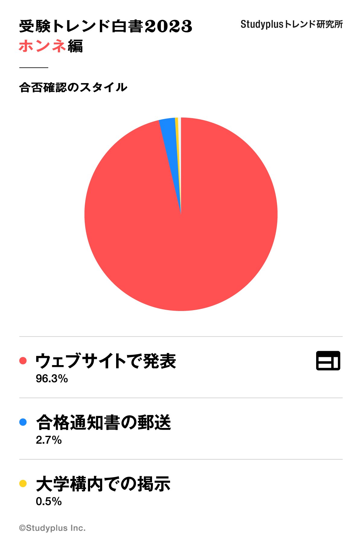 ウェブサイトでの発表が96.3%となっており、大学構内での掲示は0.5%にとどまっております。