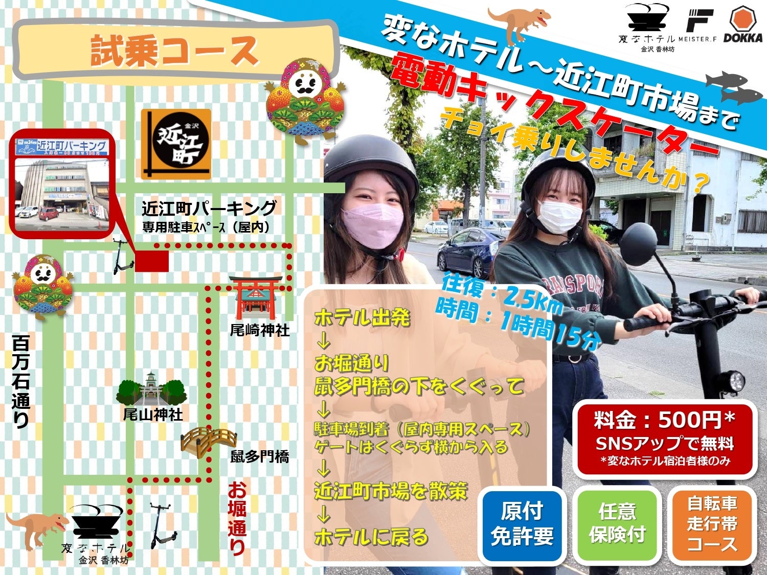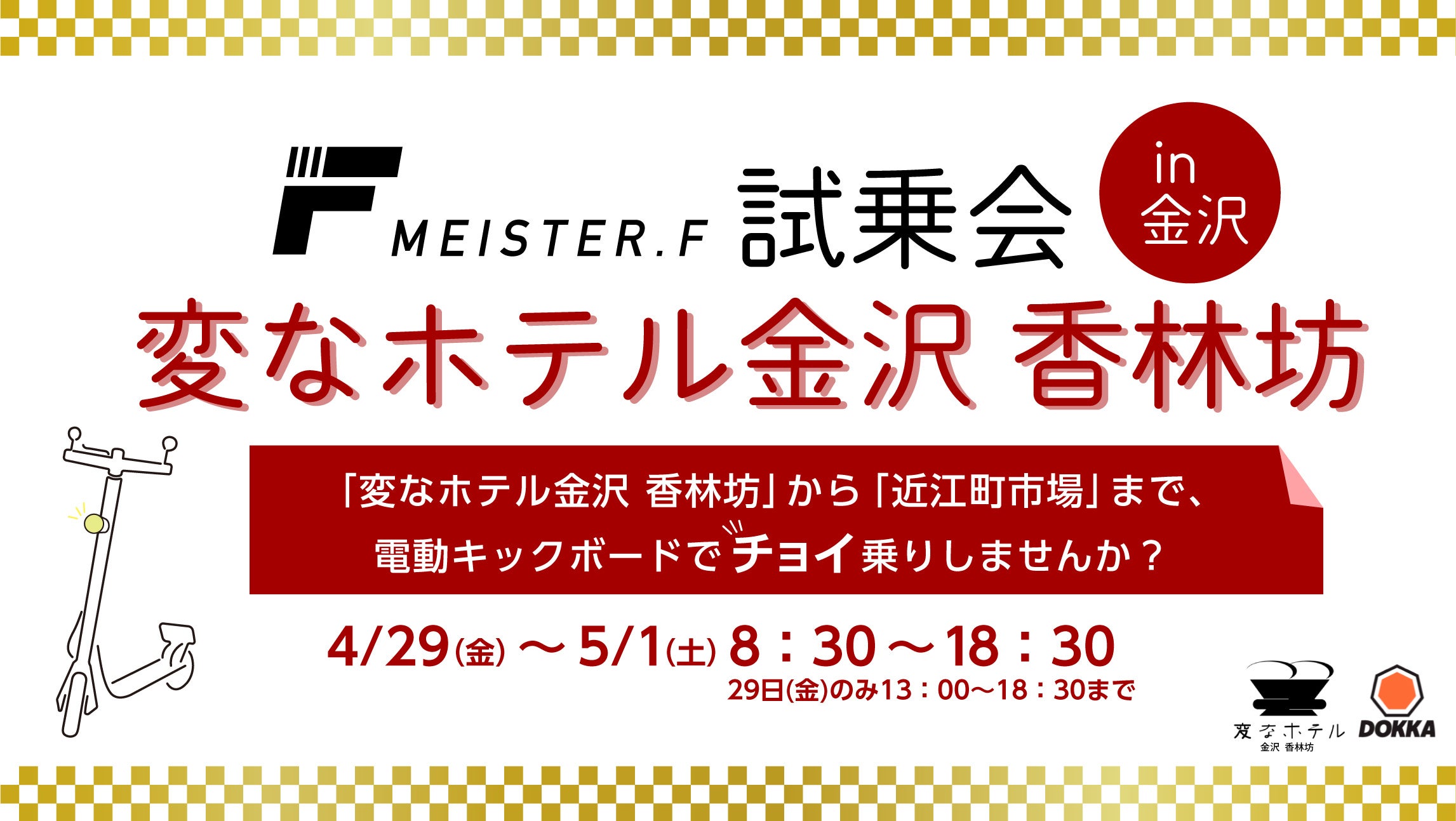ゴールデンウイークの4月29日(金)~5月1日(日)に、金沢市にてMEISTER.Fキックボードを「変なホテル金沢 香林坊」から「近江町市場」までチョイ乗りできる試乗会を開催決定。