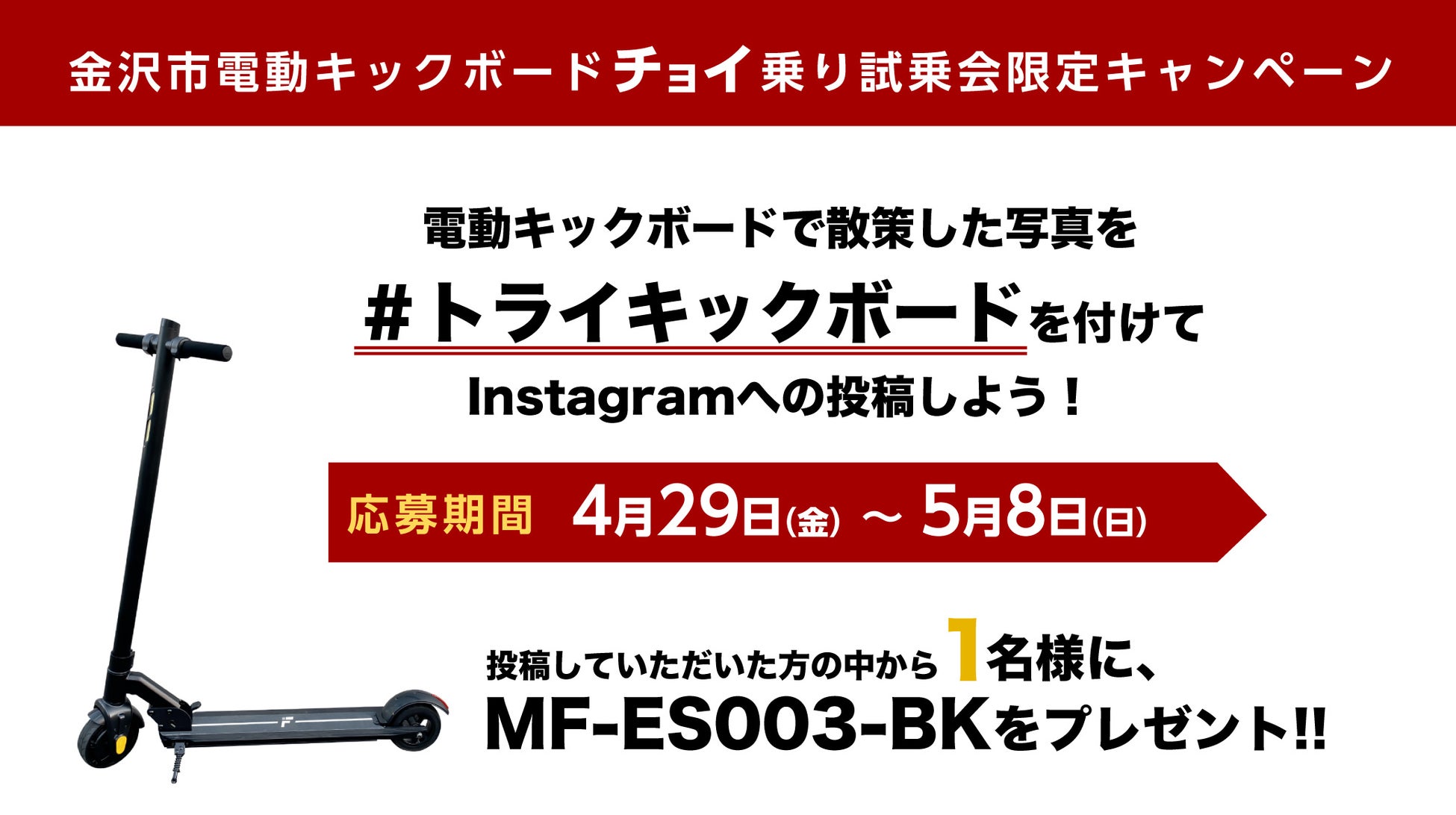 試乗会にて電動キックボードで、FUGU INNOVATIONS JAPAN公式Instagram(fugu_Japan)をフォローして頂き、さらに「変なホテル金沢 香林坊」から「近江町市場」まで散策した写真を、Instagramに#トライキックボードを付けて投稿して頂いた方の中から抽選で1名様に、MEISTER.Fのレジャー用電動キックボード(MF-ES003-BK)をプレゼントします。