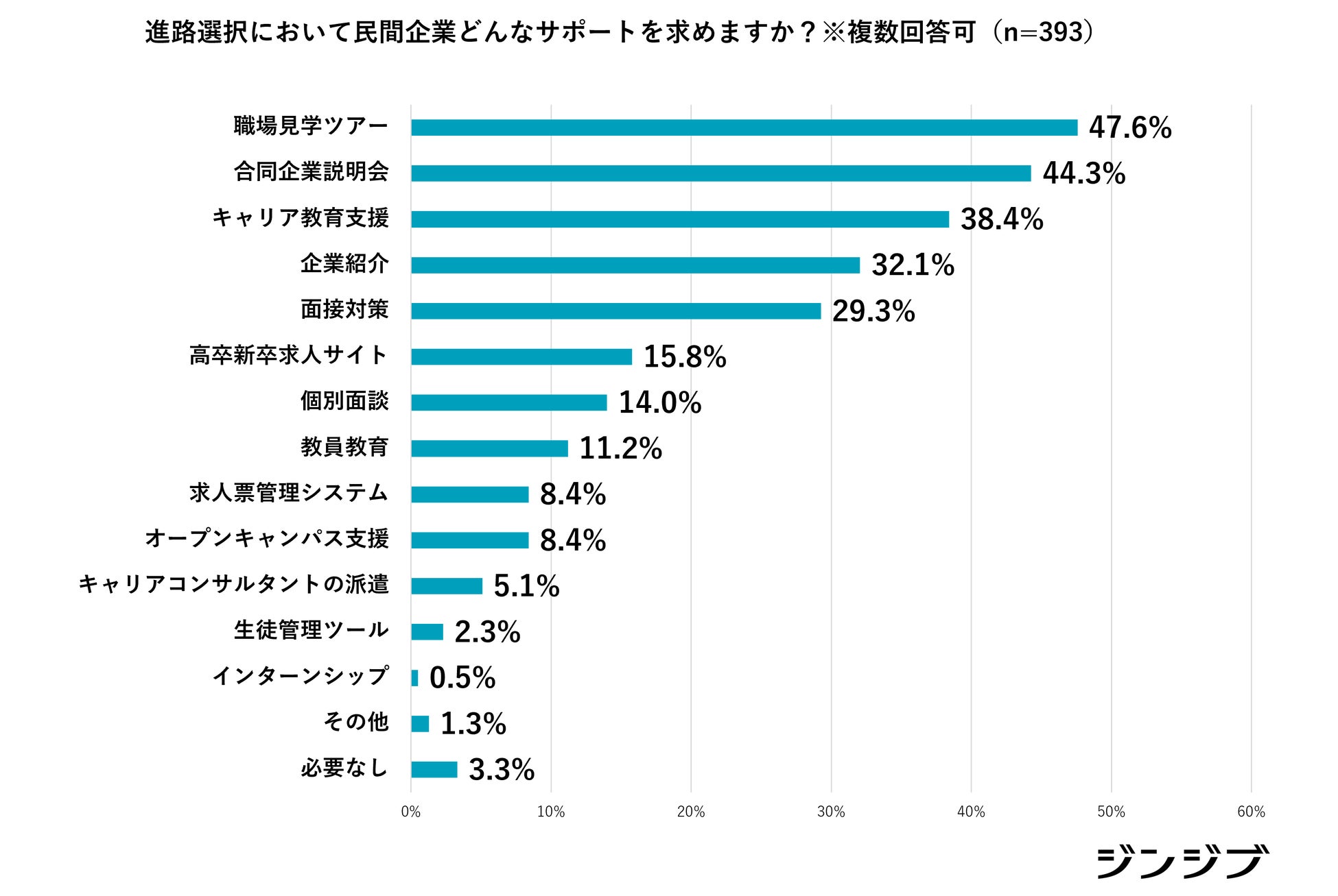 アンケートから、生徒の進路選択における民間企業のサポートについて、「55.5%」の方が検討している回答しました。中でも、「職場見学ツアー」47.6%、「合同企業説明会」44.3%と、企業との接点機会を求めている先生が多いことが分かります。
