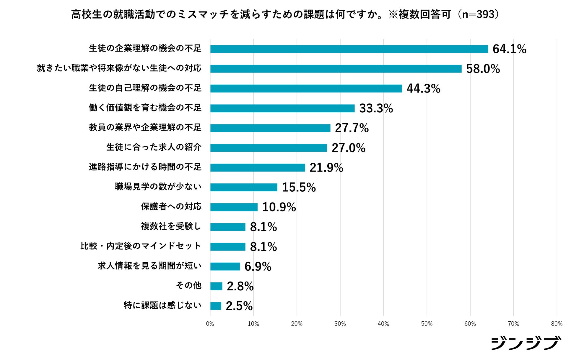 生徒のミスマッチを減らすための課題において、半数以上の先生が「生徒の企業理解の不足」64.1%、「つきたい職業や将来像がない生徒への対応」58%と回答しました。早くからのキャリア教育を通じて、自身の興味関心を知る機会や様々な企業や業界を知り理解を深めることが必要であると考える先生が多いと言えます。