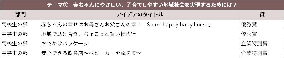 赤ちゃんにやさしい社会を実現するためには、幅広い世代に赤ちゃんや子育てについて知ってもらい、どのようなサポートができるか考えてもらう機会を提供することが重要と考えています。その取り組みの一環として「ティーンズ・アイデアコンテスト」のテーマ提供企業に応募し、テーマ『赤ちゃんにやさしい、子育てのしやすい地域社会を実現するためには?』を提供いたしました。