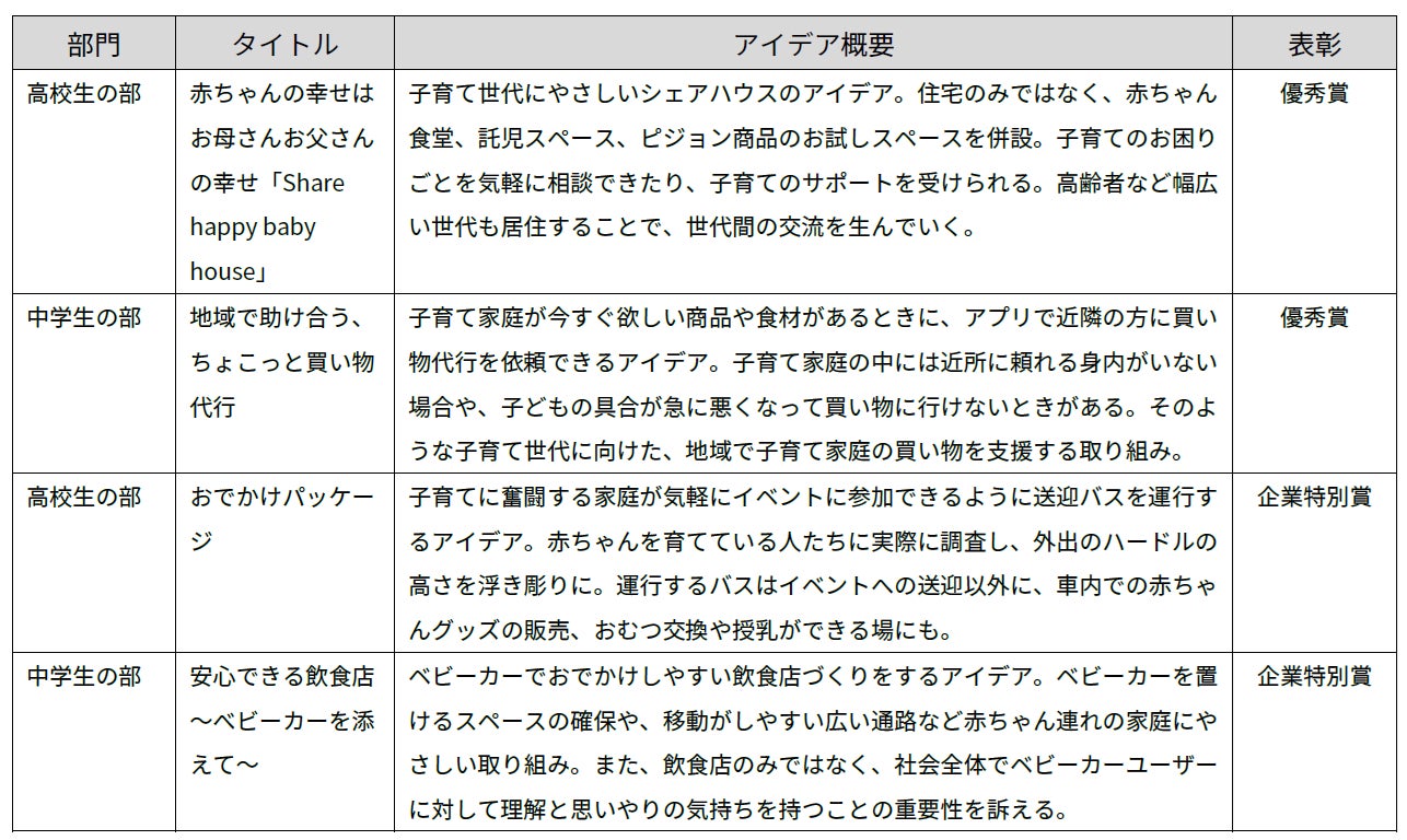 ピジョン提供のテーマ「赤ちゃんにやさしい、子育てのしやすい地域社会を実現するためには?」の応募アイデアが優秀賞を受賞