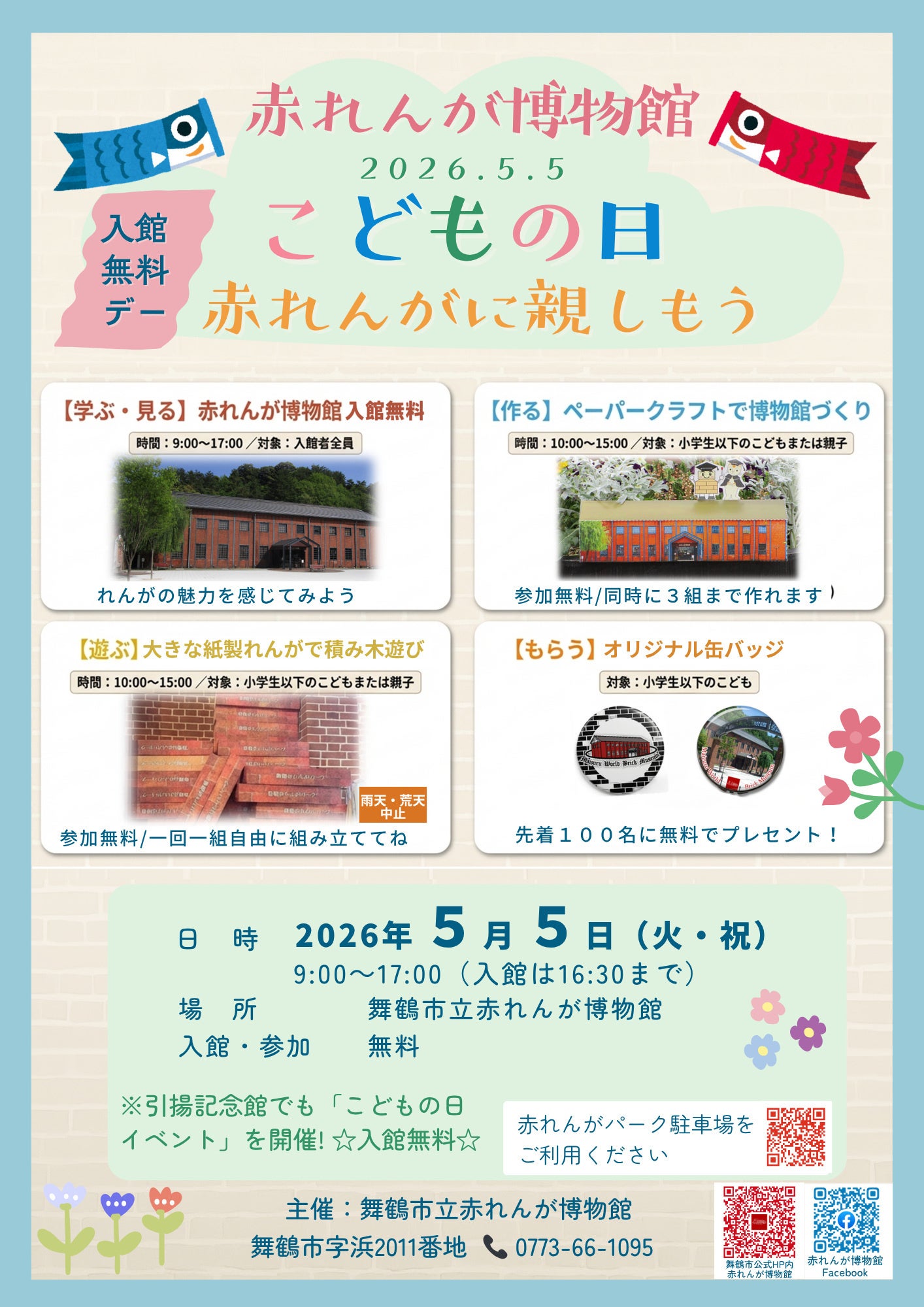 舞鶴市立赤れんが博物館は、5月5日(祝)の「こどもの日」に合わせ、大人から子どもまで楽しめる特別イベント『赤れんがに親しもう!』を開催します。当日はすべての方を対象に入館料を無料で開放し、未来を担う子ども達に地域の歴史と文化を体感する機会を提供します。