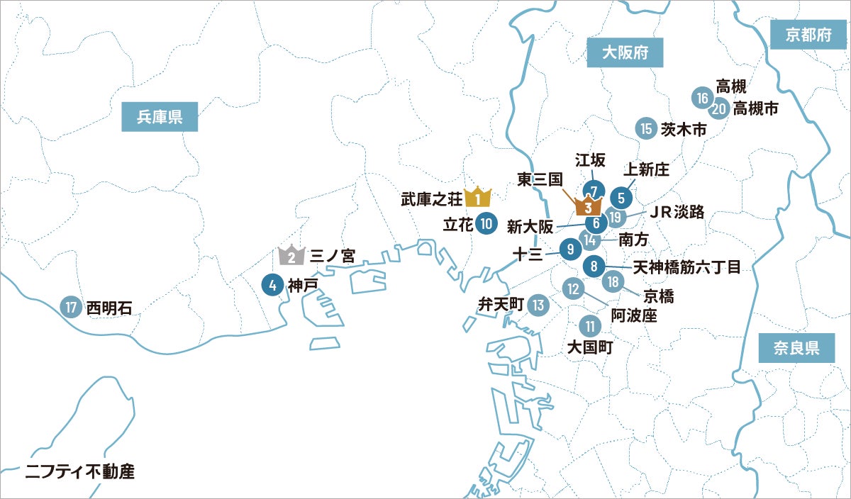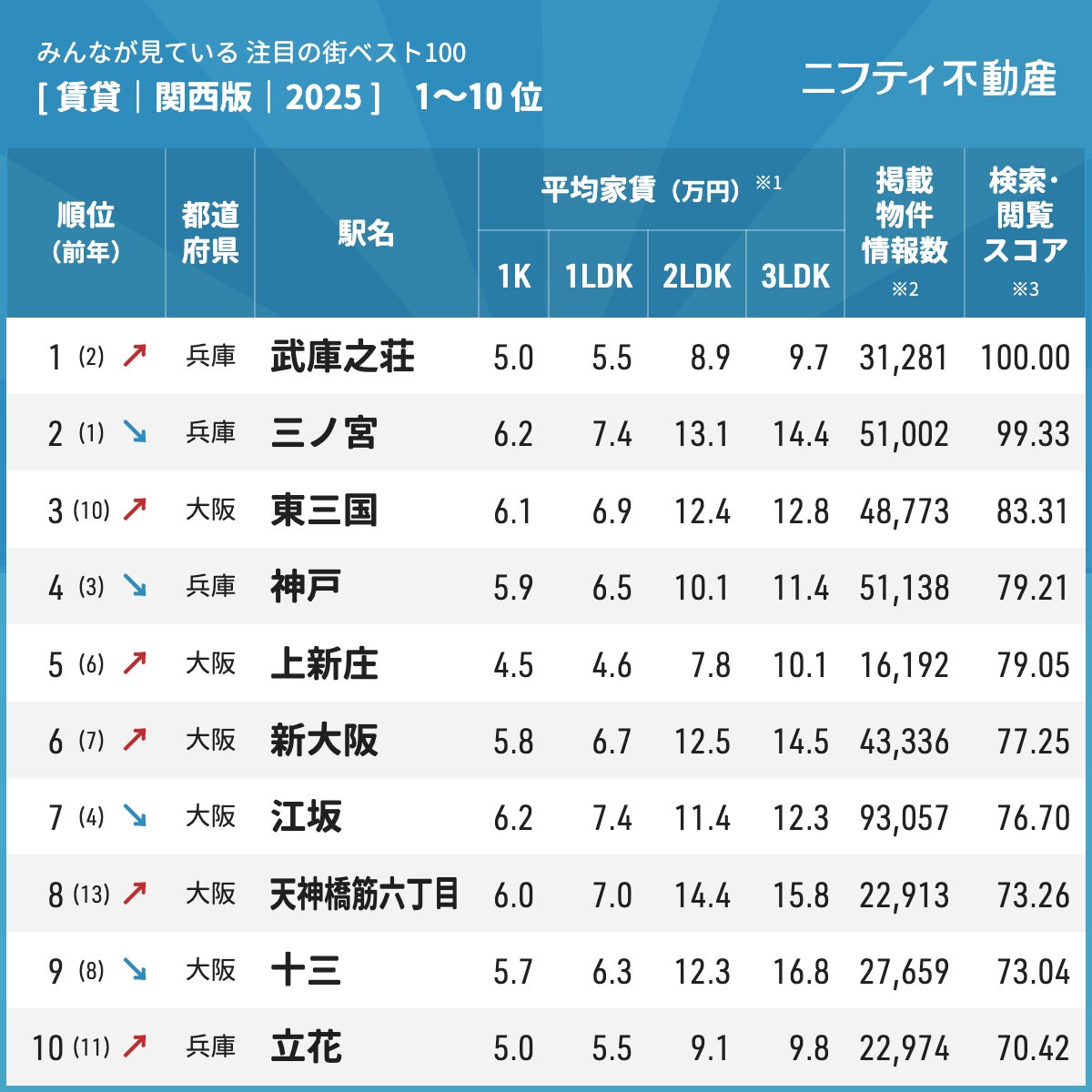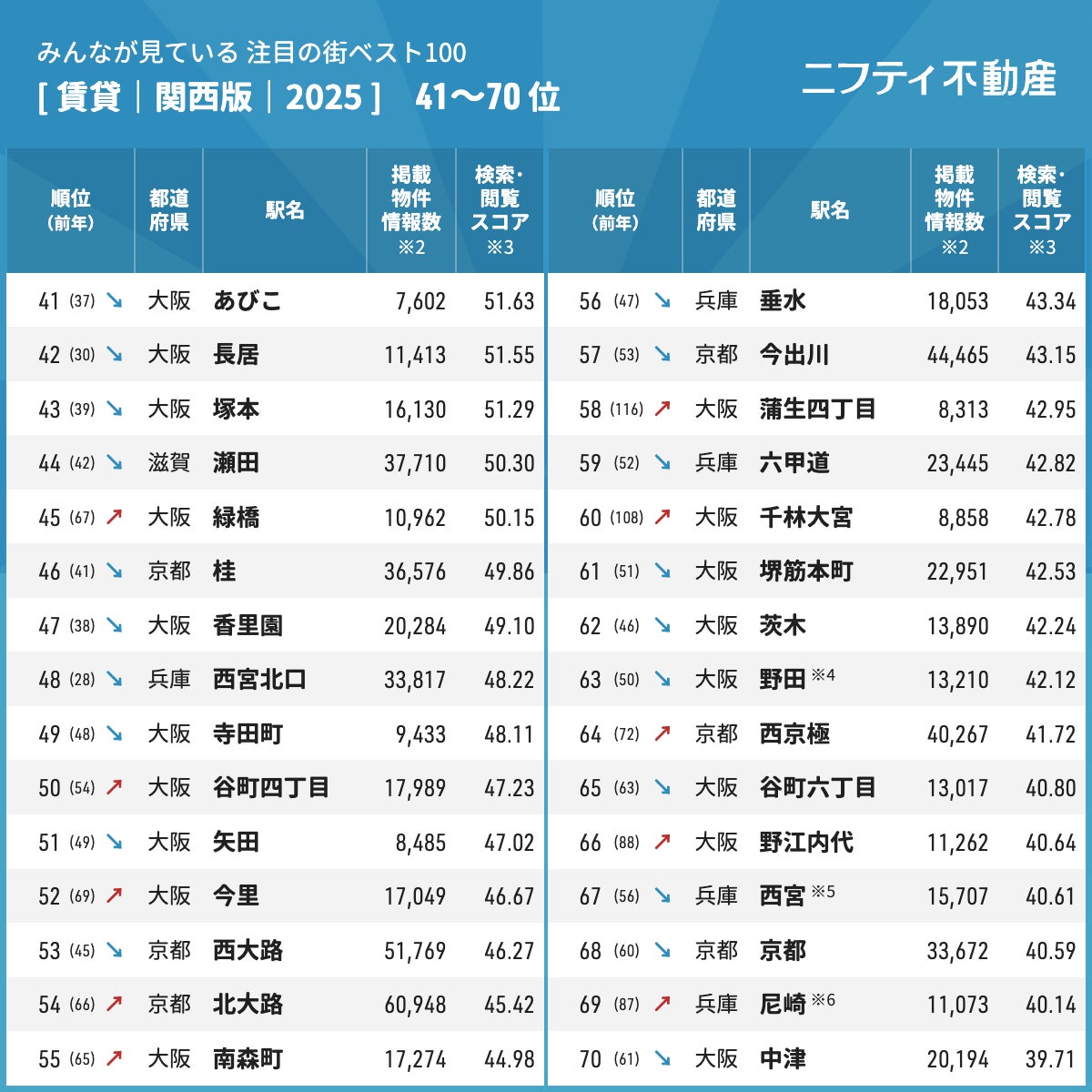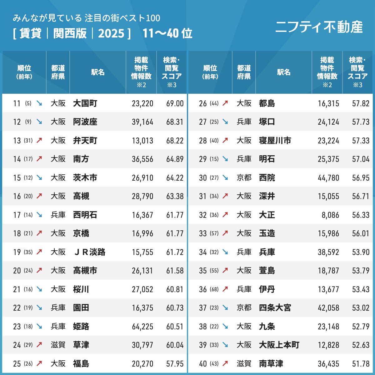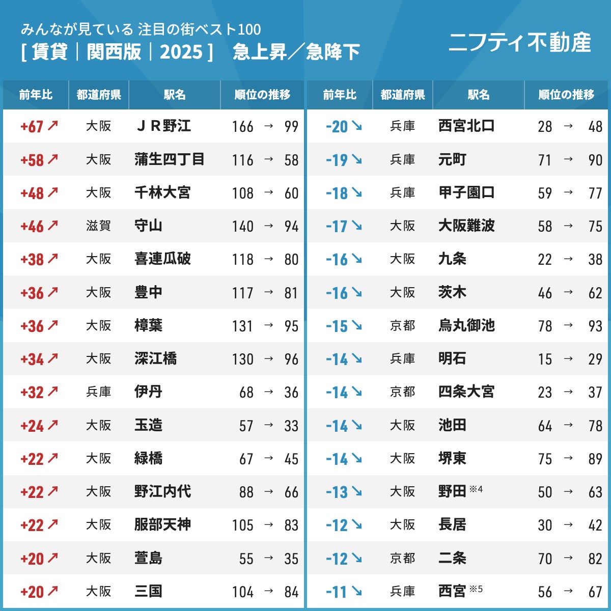 ニフティ不動産 注目の街ランキング拡大版!年間ランキング2025【関西ベスト100】発表!