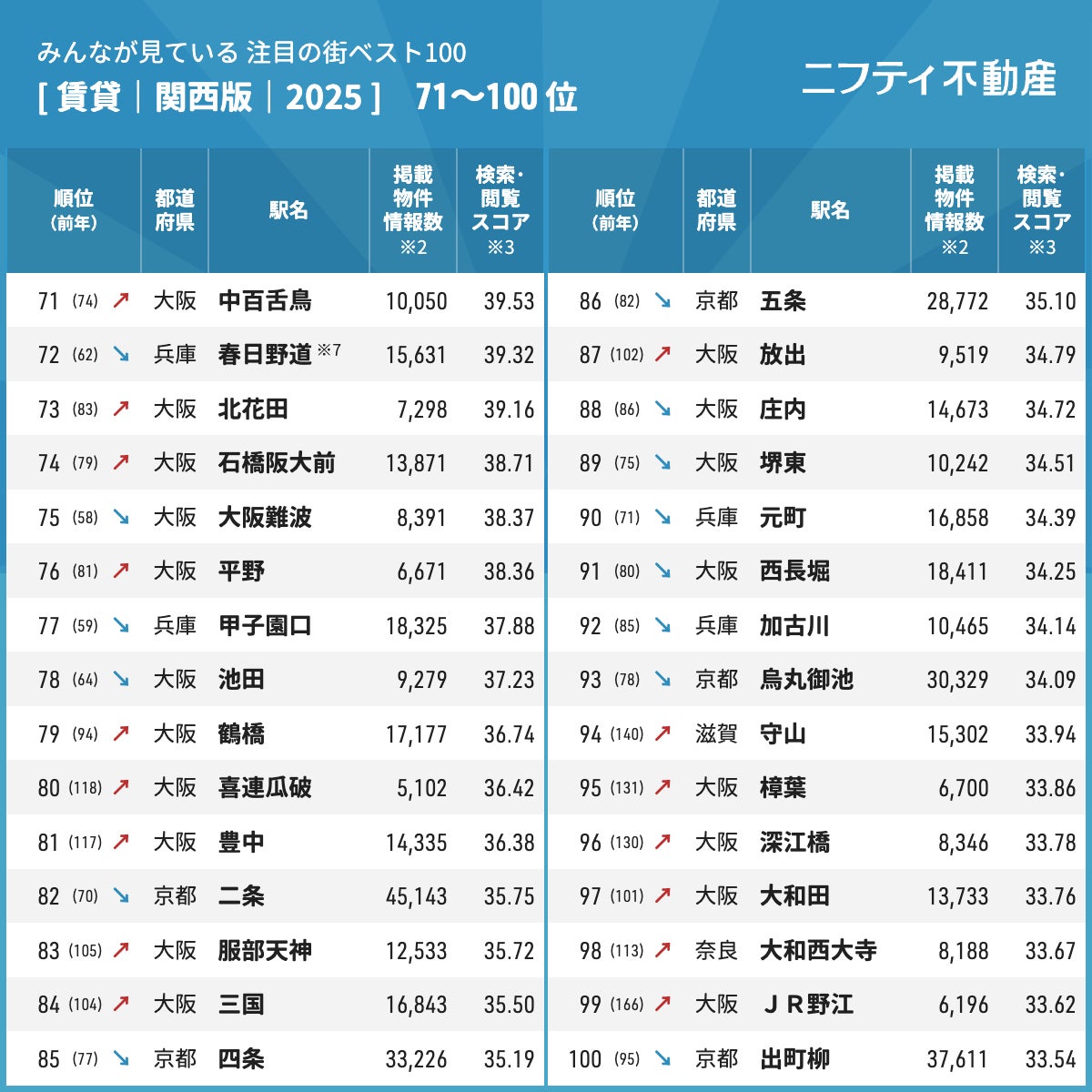 大阪・兵庫・京都の三都市圏がベスト100の約9割を占める中、京都では「西京極」(72位→64位)や「北大路」(66位→54位)がランクアップ。一方で、「四条大宮」(23位→37位)や「烏丸御池」(78位→93位)など、観光地に近い京都都心部は順位を下げる結果となりました。