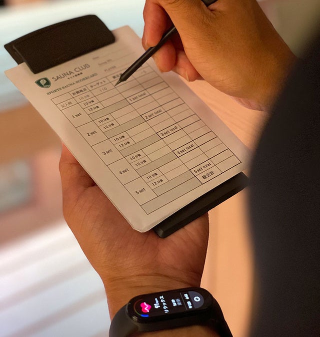 ①スポーツサウナ専用のスコアーカードに天候や環境に合わせて計測時間を決めます。