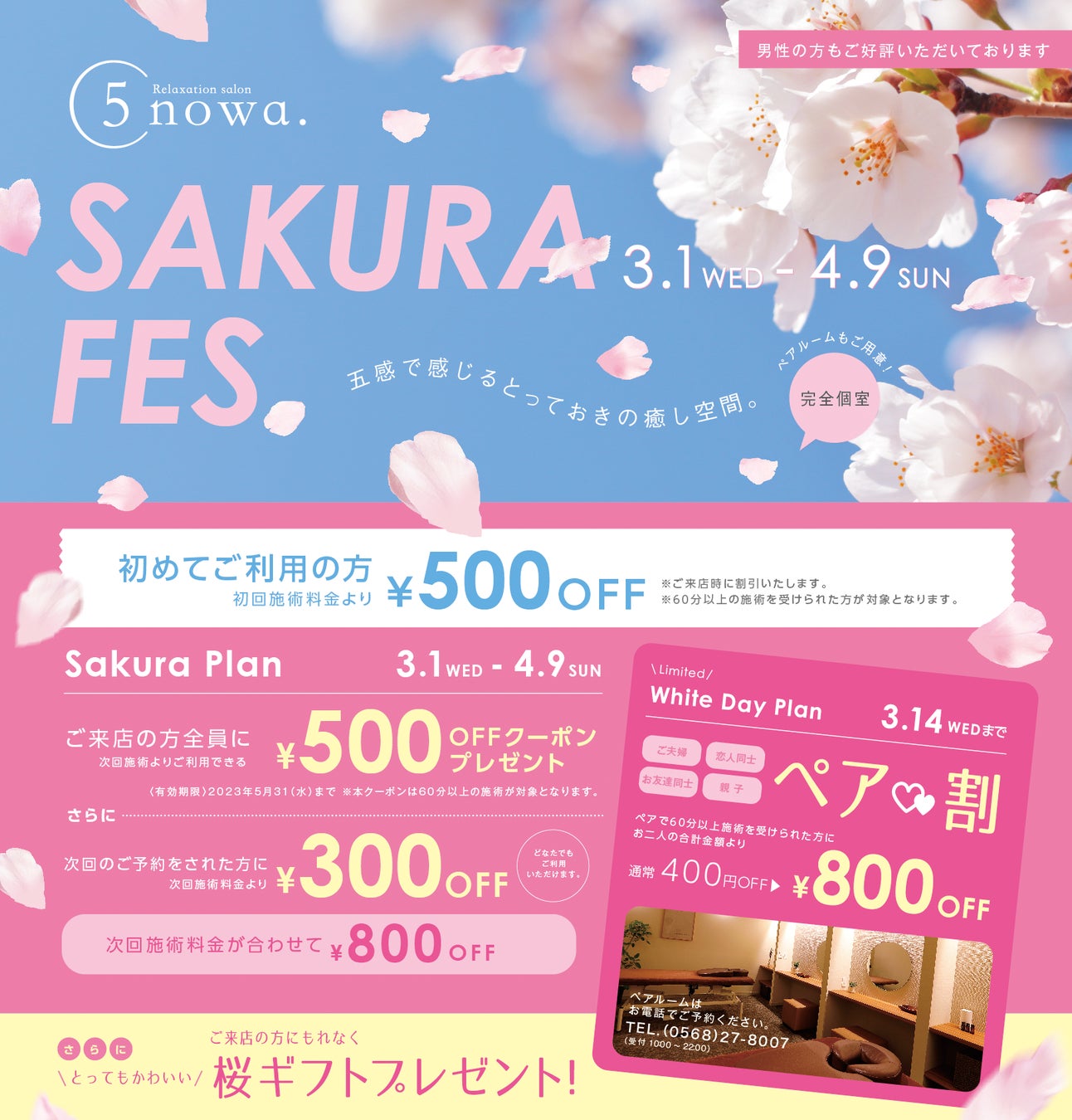 愛知県春日井市リラクゼーションサロン「5nowa.」3月1日(水)~4月9日(日)までSAKURAFES(サクラフェス)を開催