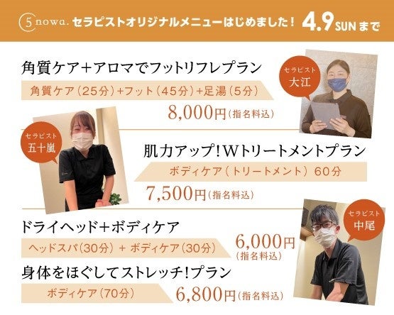 新生活が始まるこの季節、体や心がお疲れの方にオススメです。全身がリフレッシュする期間限定のメニューを是非お試しください。