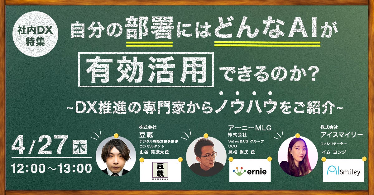 企業のDXを推進する国内最大級の AI ポータルメディア「AIsmiley」を運営するアイスマイリー(東京都渋谷区、代表取締役:板羽晃司)は、2023年4月27日(木)12時から社内DX特集ウェビナーを開催します。