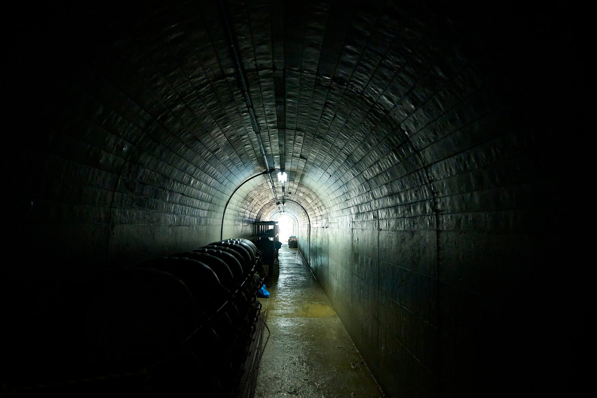 BEYONDTIMEの熟成地は標高1050mのアルプスの山々の中にあるダム横の隧道(トンネル)。標高の高いトンネルの温度は年間を通じて10℃前後、扉を閉めると光も音も遮断された環境はもっとも適した自然環境。