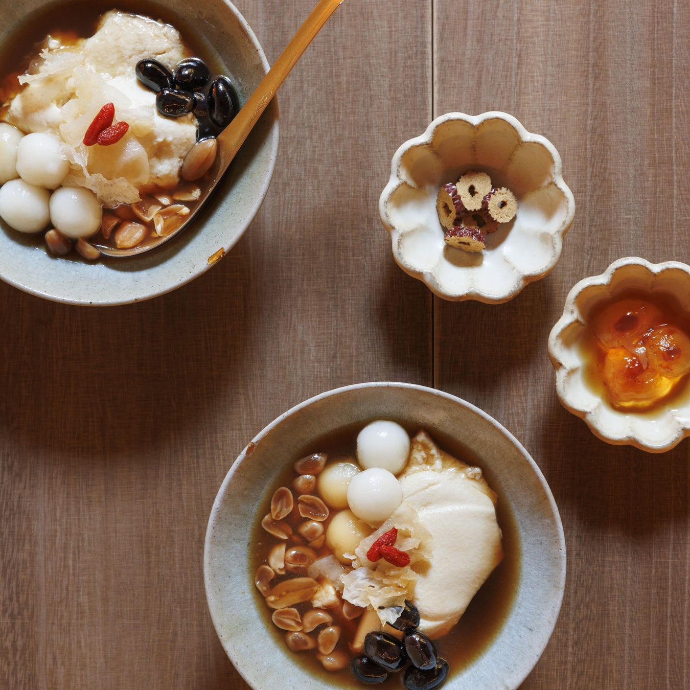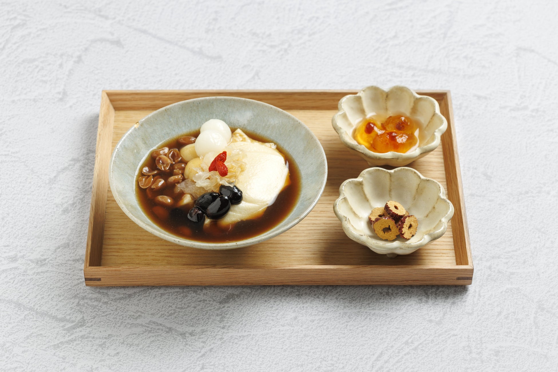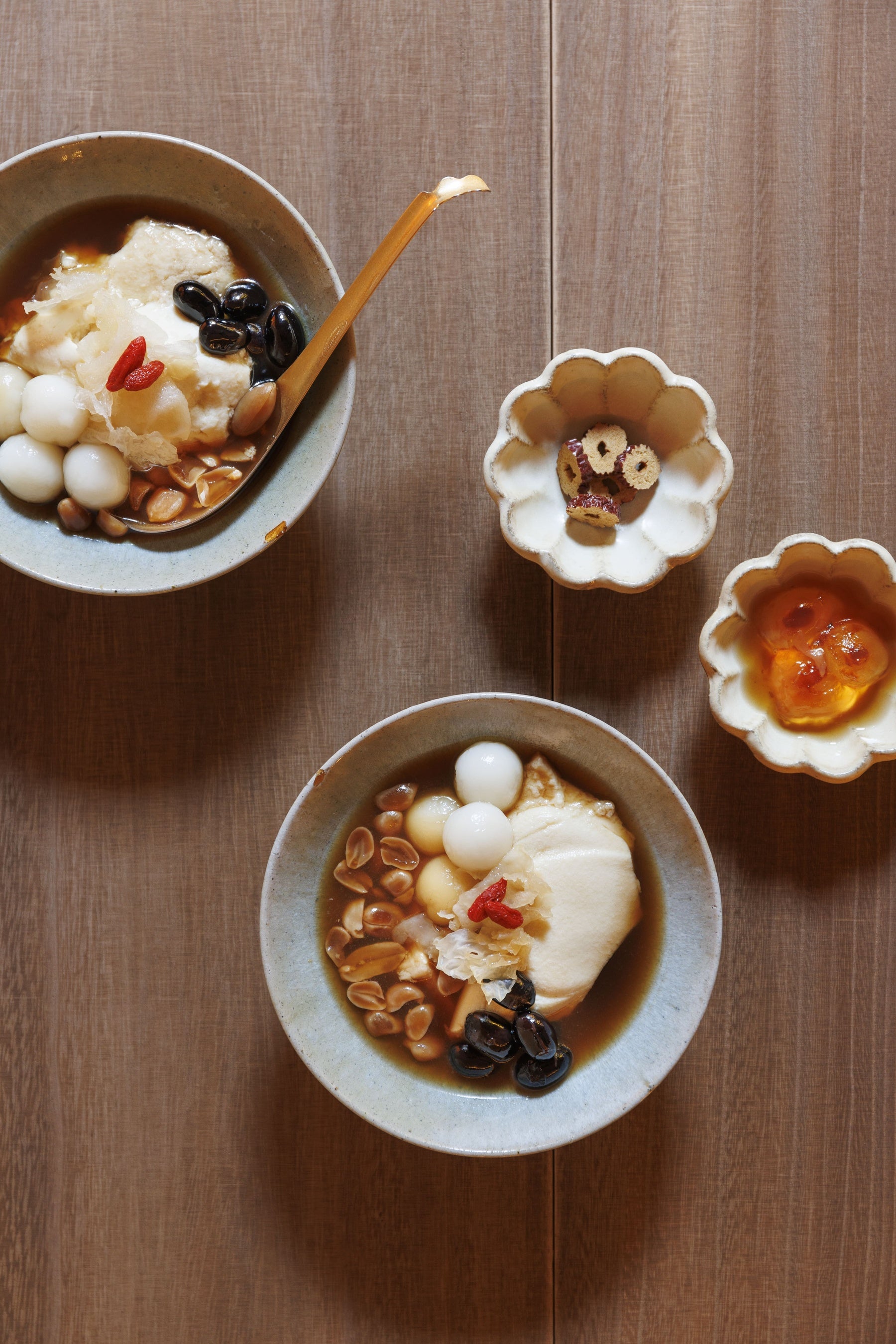 少し温かめに仕上げた滑らかな豆花に、免疫機能を高める生姜のシロップを合わせました。体に必要な潤いを補う白キクラゲや、たんぱく質が豊富なピーナッツや黒豆などをバランス良くトッピング。