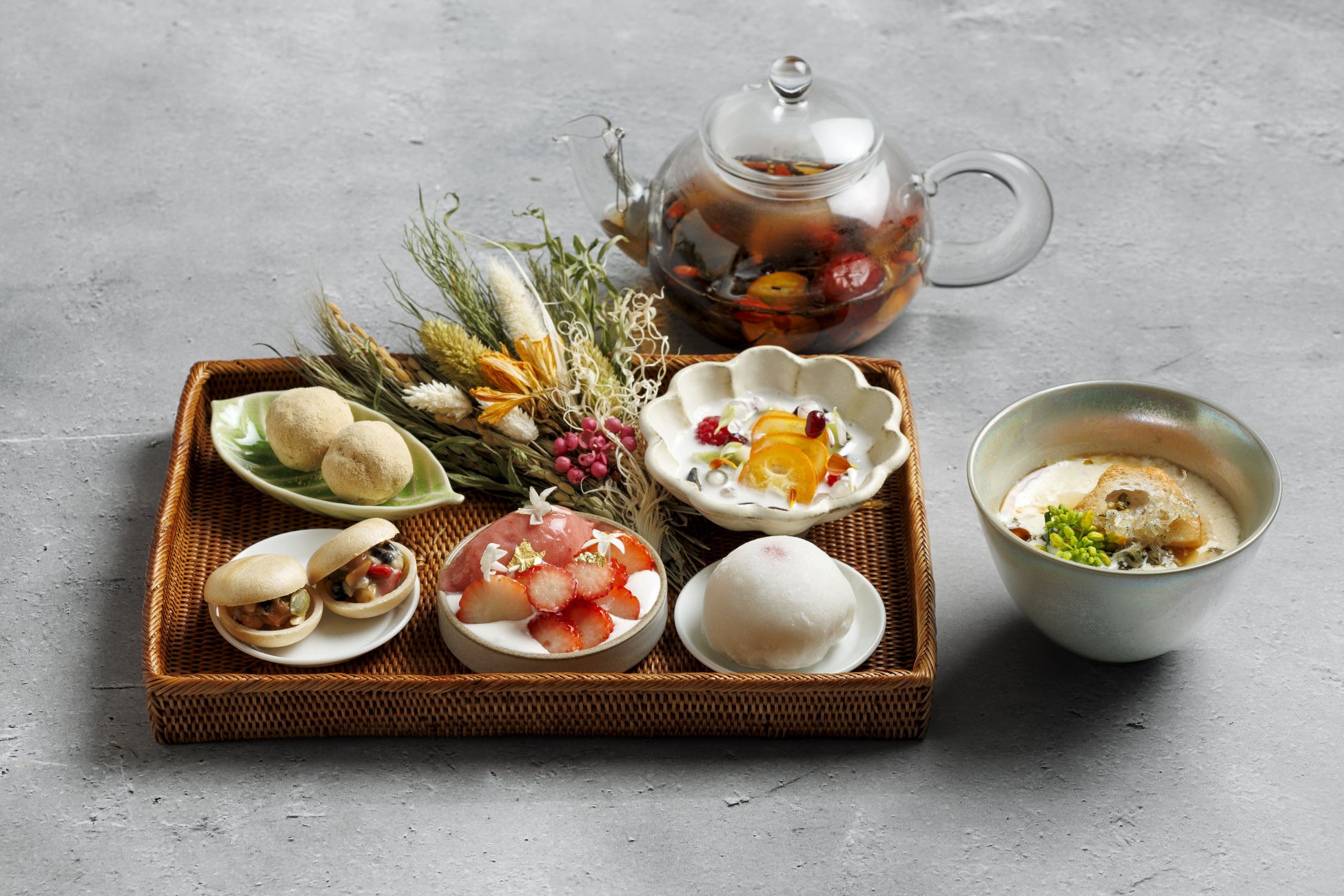 他にも、抗酸化作用のある黒豆を使ったきな粉ボールや、キャラメリゼしたナッツを挟んだ最中、金柑やザクロなどが入ったココナッツのお汁粉など、バラエティ豊かなティーセットに。
