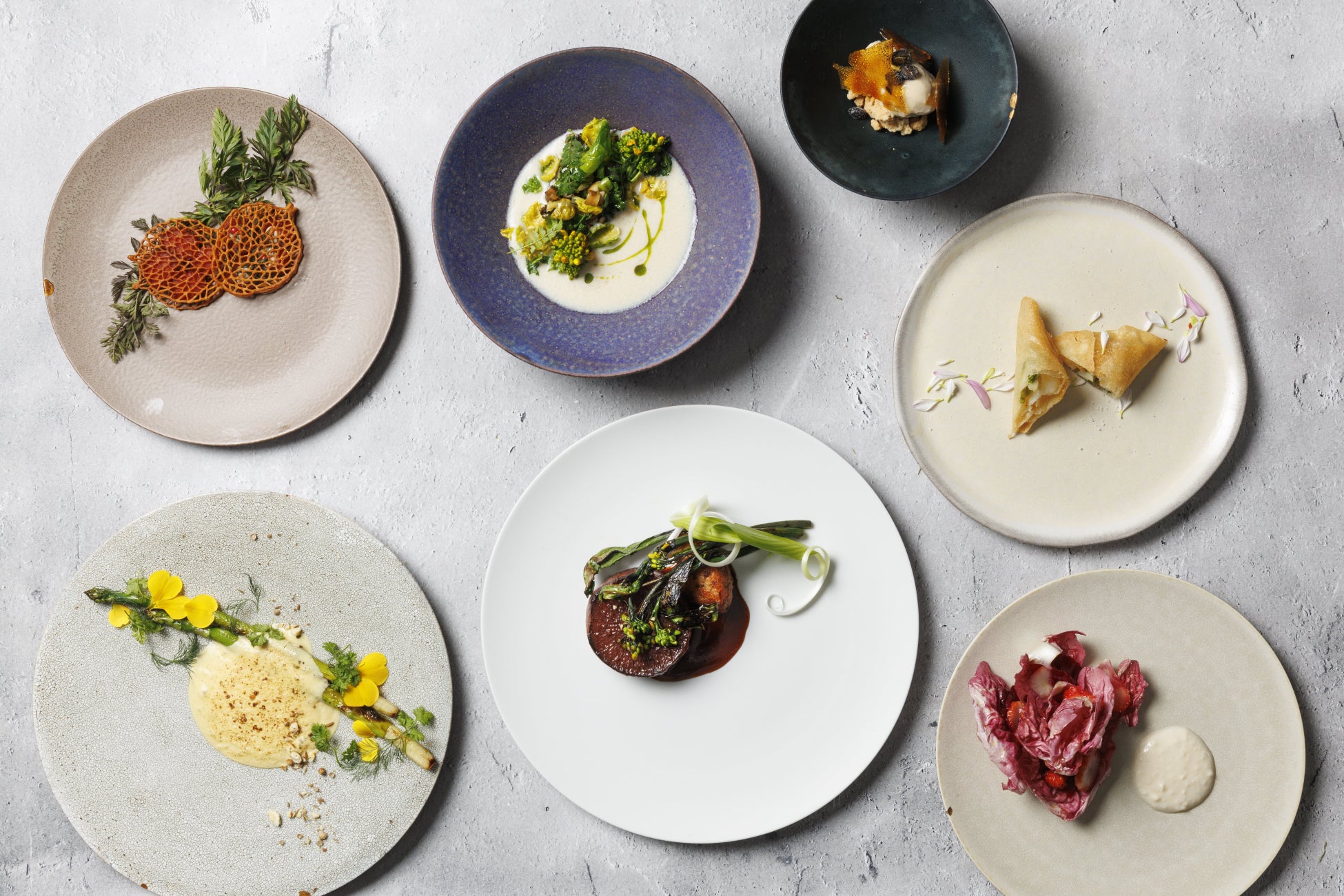 山田ファームさんのニンジンのチュイル/トレヴィス、ビーツ、イチゴの赤いサラダ/山菜のパートブリック包み焼き蓬麩と春野菜 蕪のポタージュ仕立て/アスパラガスのロースト ヴィーガンオランデーズソース/有機大根のバルサミコロースト/フキノトウのジェラート