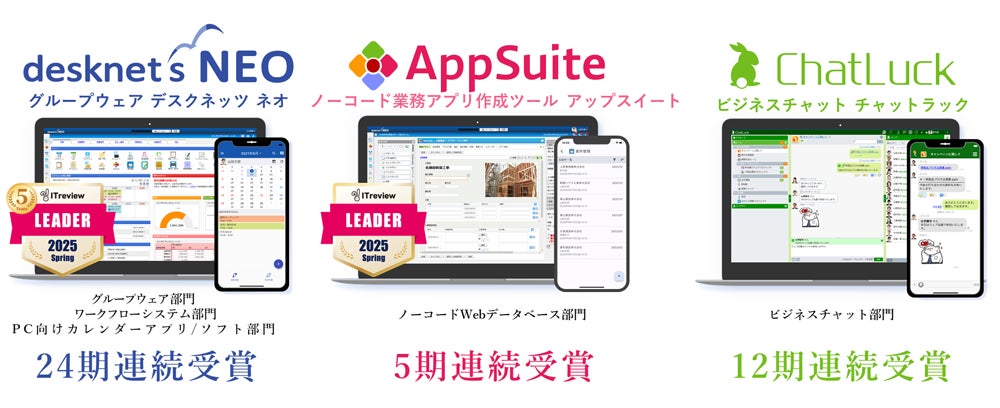 株式会社ネオジャパン(本社:神奈川県横浜市、代表取締役社長:齋藤 晶議)は、アイティクラウド株式会社(本社:東京都港区、代表取締役社長:黒野 源太)運営のIT製品比較・レビューサイト「ITreview」が主催する「ITreview Grid Award 2025 Spring」において、グループウェア『desknet's NEO』、ノーコード業務アプリ作成ツール『AppSuite』、ビジネスチャット『ChatLuck』が、それぞれ4部門で最高位である「Leader」を受賞したことをお知らせします。グループウェア『desknet's NEO』は、24期連続での受賞となり、その使いやすさと顧客満足度の高さが評価されています。