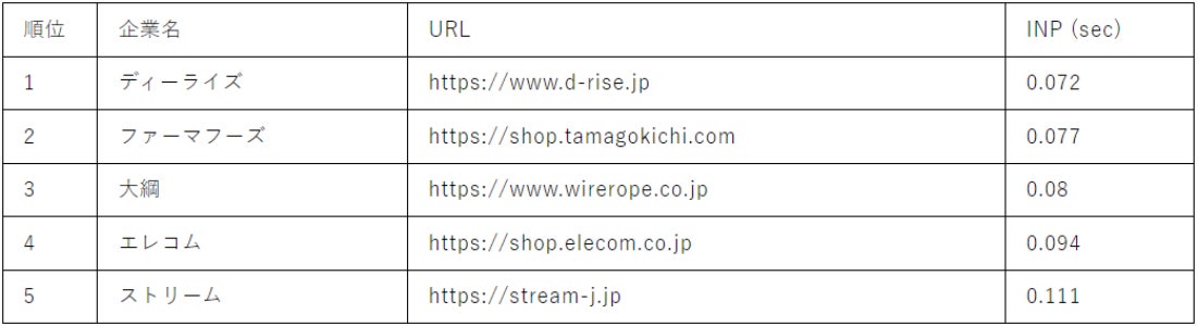 また、今回の記事より、INP(Interaction to Next Paint)スコアの高いサイトに関してもTOP5を掲載しました。