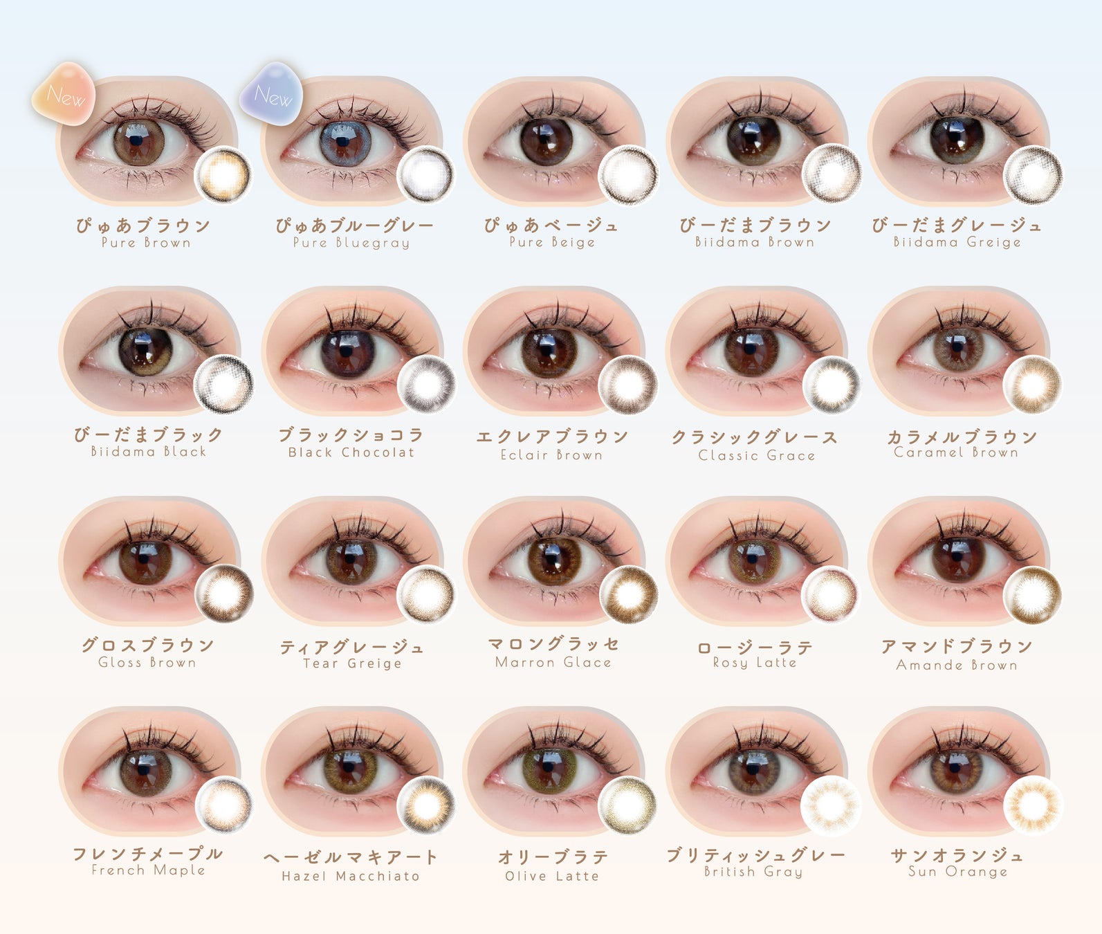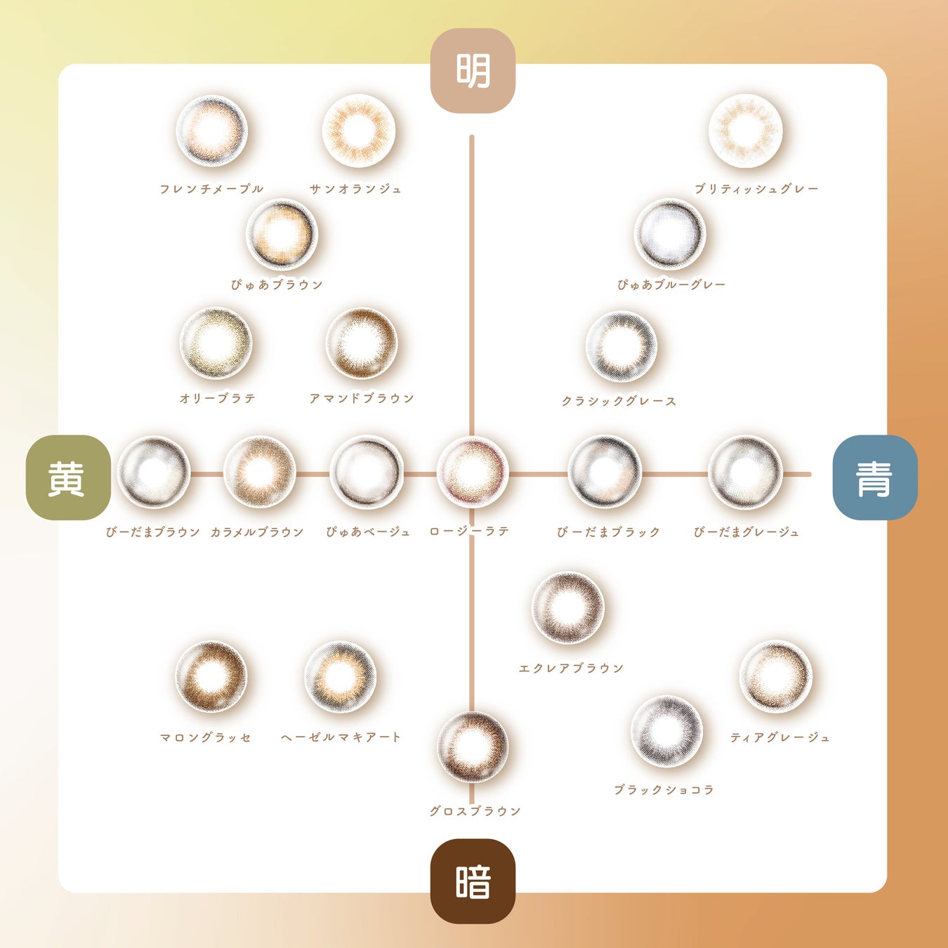 14.4mm(ぴゅあブラウン、ぴゅあブルーグレー、ぴゅあベージュ、びーだまブラック、びーだまブラウン、びーだまグレージュ、クラシックグレース、エクレアブラウン、グロスブラウン) 14.2mm(フレンチメープル、アマンドブラウン、カラメルブラウン、オリーブラテ、ロージーラテ、ティアグレージュ、サンオランジュ、ブリティッシュグレー、ブラックショコラ、マロングラッセ、ヘーゼルマキアート) |