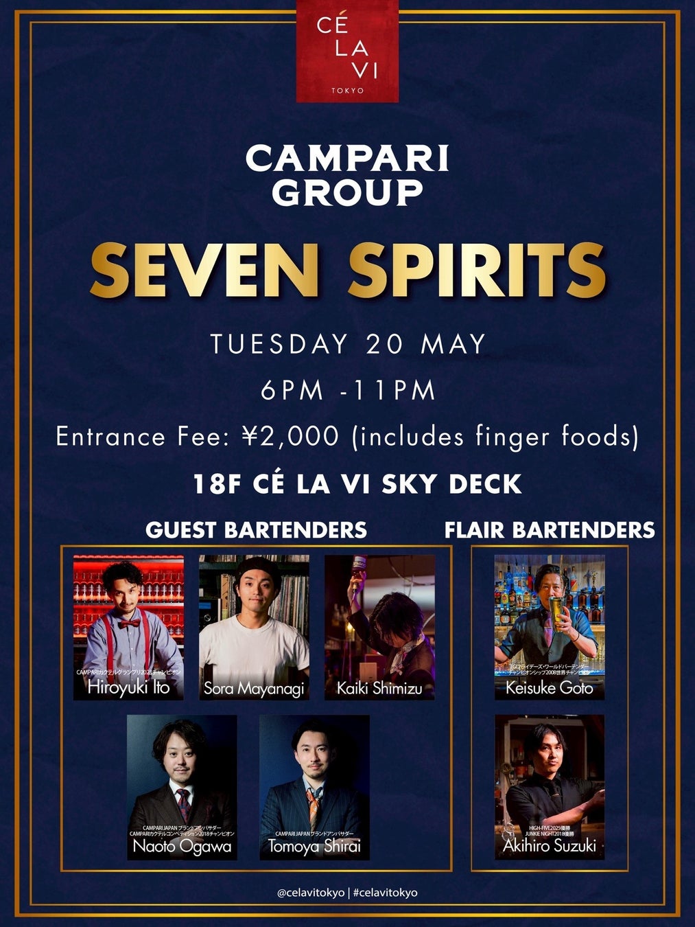 CAMPARI JAPAN(本社:東京都港区/代表取締役社長:阿部 哲)は、株式会社ICONIC LOCATIONS JAPAN(本社:東京都渋谷区 / 代表取締役:稲塚 晃裕)が運営するCÉ LA VI TOKYO(東京都渋谷区道玄坂1-2-3東急プラザ渋谷17階・18階)とコラボレーションを実施し、7名のバーテンダーが集結する「SEVEN SPIRITS」を開催いたします。