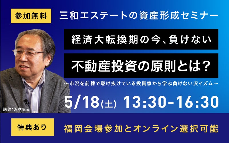 約1年半ぶりの開催となる三和エステートの資産形成セミナーは、不動産投資歴25年の 沢 孝史氏 を講師にお迎えした、オンライン(Zoom)・オフライン(福岡会場参加)が選べるハイブリッド型のセミナーです。 なんと参加費は無料!揺れ動く市況でも負けない不動産投資の原則が学べる内容となっておりますので、ぜひ参加をご検討ください。