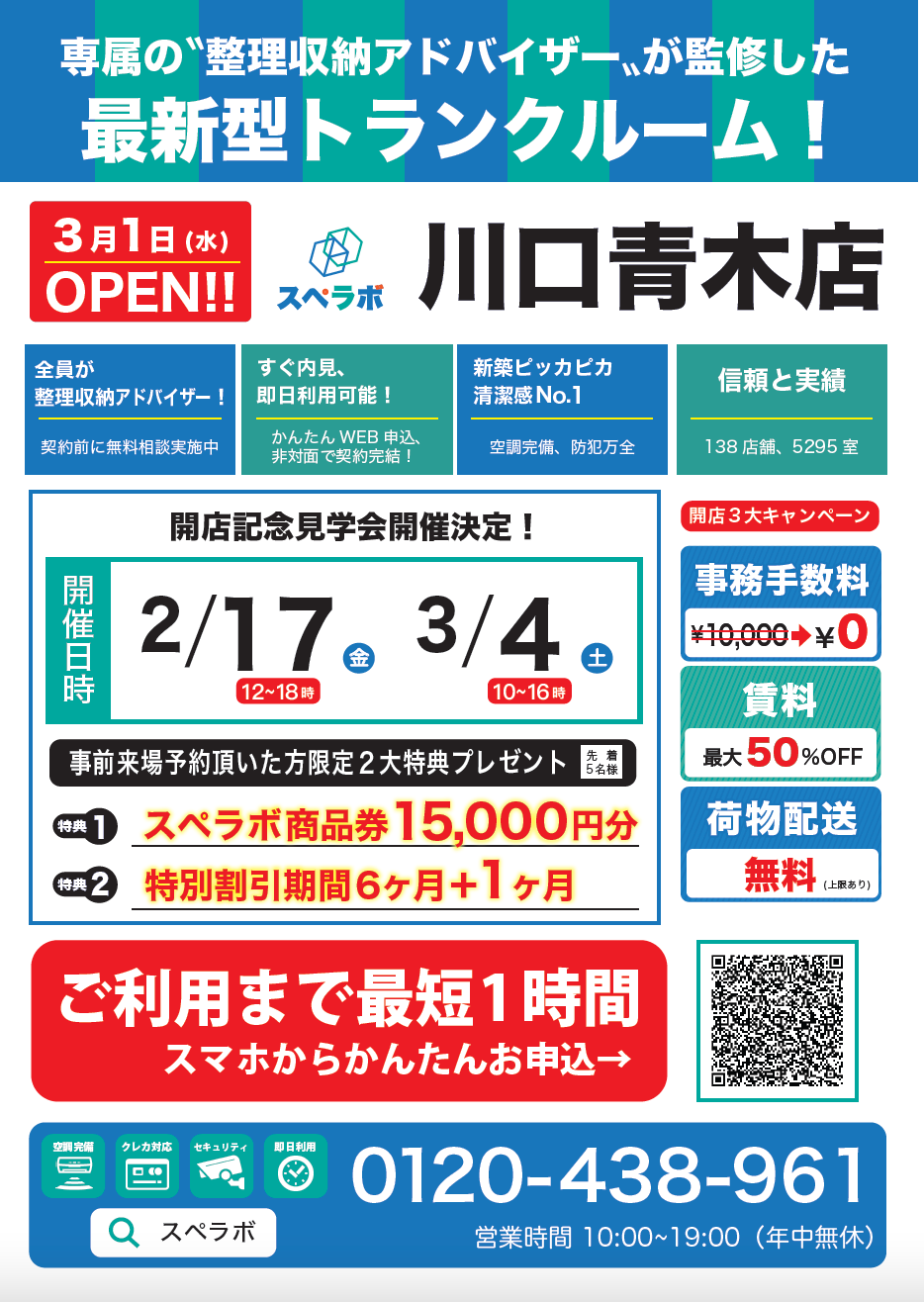 【川口青木店/3月1日(水)オープン】見学から契約、解約まで完全非接触・非対面、お申し込みからご利用まで最短1時間!都内、大阪などにて絶賛運営中のトランクルーム【スペラボ】が川口駅近くに出店!