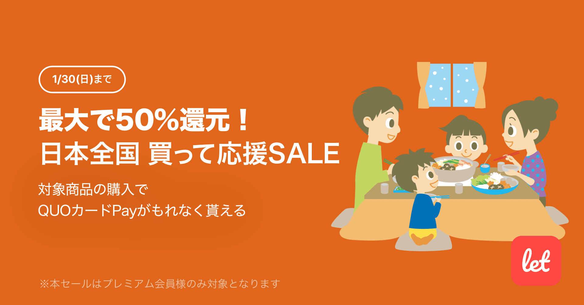 株式会社レット(本社:東京都港区、代表:佐藤 航陽)が運営する、食品ロス/在庫ロス削減のマーケット「Let(レット)」内で「最大で50%還元!日本全国 買って応援SALE」を1月28日(金) 18:00より開催します。期間中、プレミアム会員様限定で対象商品を購入頂いた方に、QUOカードPayをもれなくプレゼント。最大で実質半額にて購入可能となります。