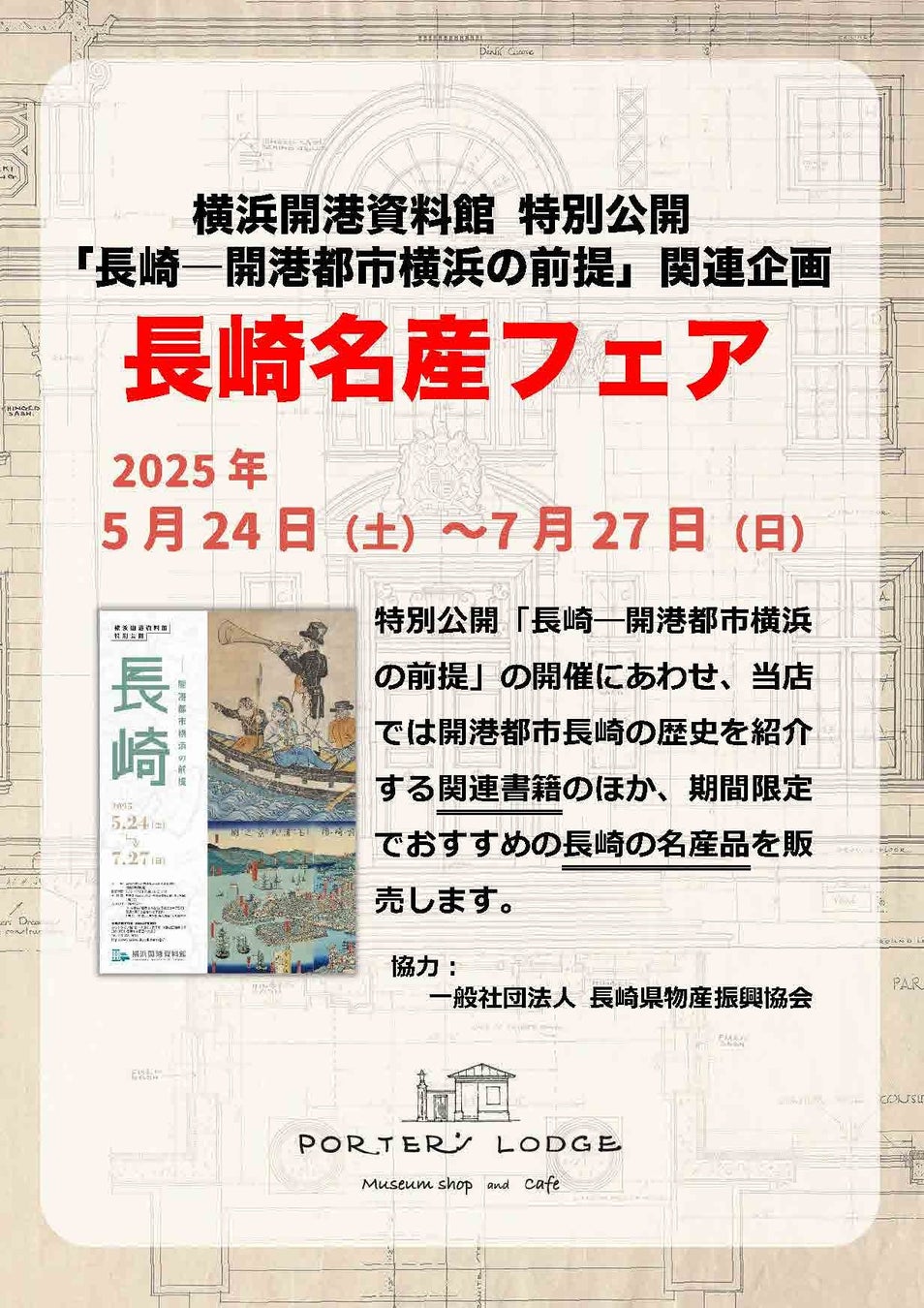 横浜開港資料館(横浜市中区 館長:西川武臣 管理運営:公益財団法人横浜市ふるさと歴史財団)は、令和7(2025)年5月24日から開催する特別公開「長崎 ―開港都市横浜の前提」にあわせ、ミュージアムショップ&カフェPORTER’S LODGEにて「長崎名産フェア」を開催します。