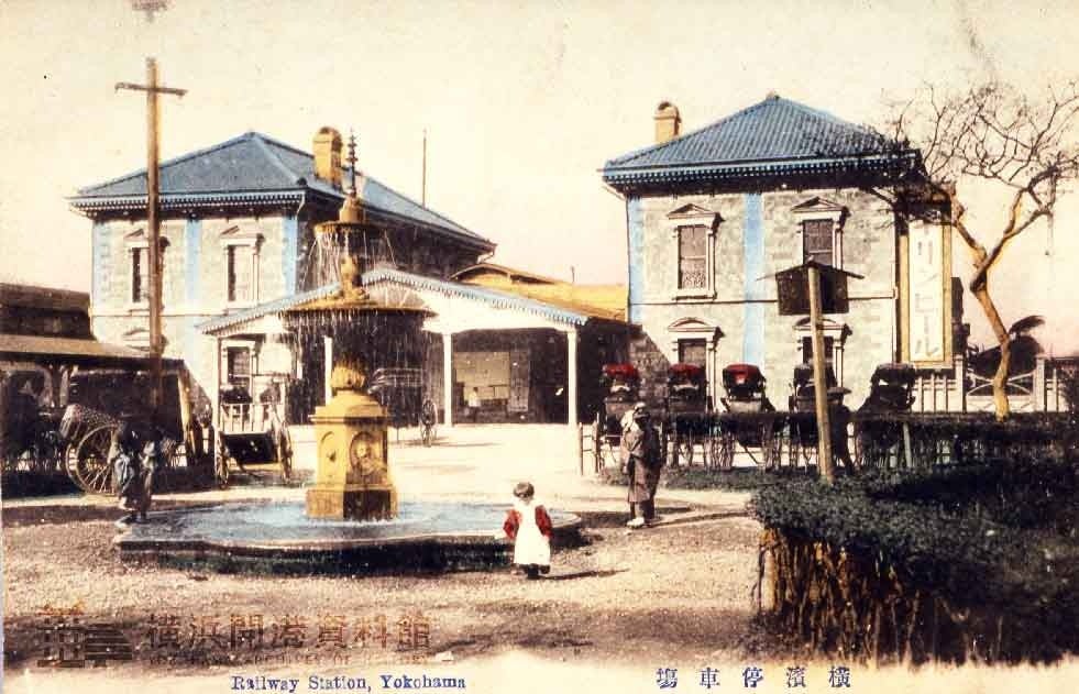 当時の横浜駅は現在の桜木町駅で、牛乳やサイダーなどの飲み物、餅、寿司などを取り扱っていました。初代横浜駅は、明治政府の富国強兵・殖産興業政策の一環として、東京の新橋と開港場横浜を結ぶ鉄道として、明治5年(1872)9月に開業しました。距離18マイル、単線で中間駅4駅、新橋・横浜間は53分で結ばれました。鉄道の建設や経営は英国人の指導・監督のもとに進められ、車両も英国製でした。