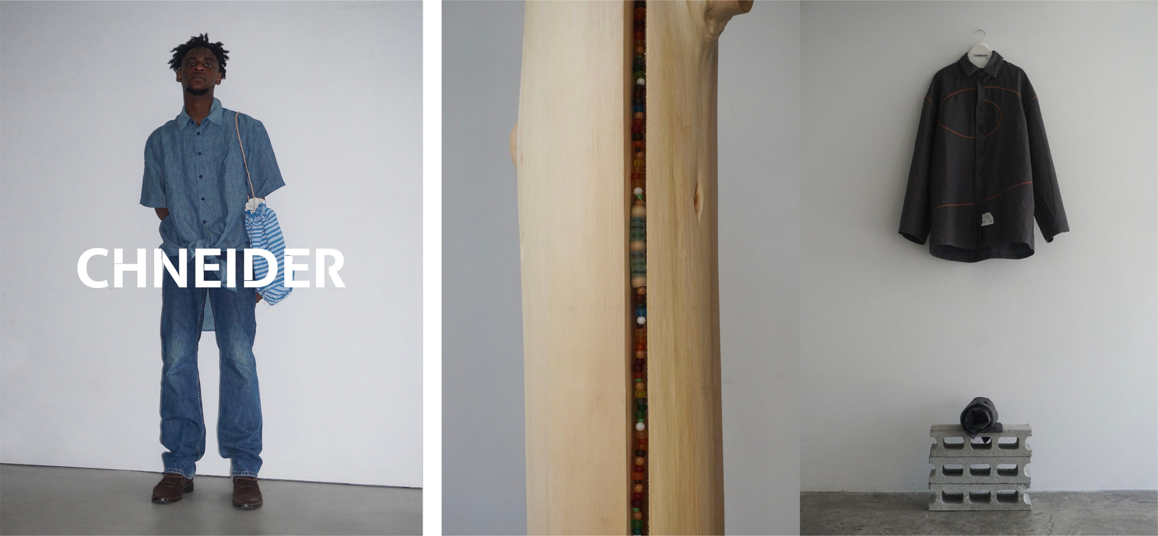 会場では、主に麻を使用した一点物の衣服を生み出すファッションブランド CHNEIDERの作品と、木という存在に寄り添い続ける彫刻家・髙山瑞の作品が、同じ空間で共存します。