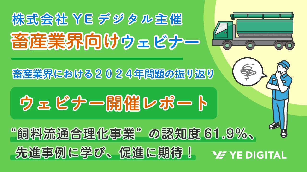株式会社YE DIGITALは、2025年2月13日(木)に飼料メーカー、飼料配送業者、畜産農家の皆さまを対象に『畜産業界における2024年問題の振り返り~飼料流通の取り組み~』ウェビナーを開催し、多くの方にご参加いただき高い関心や共感する声をいただきました。
