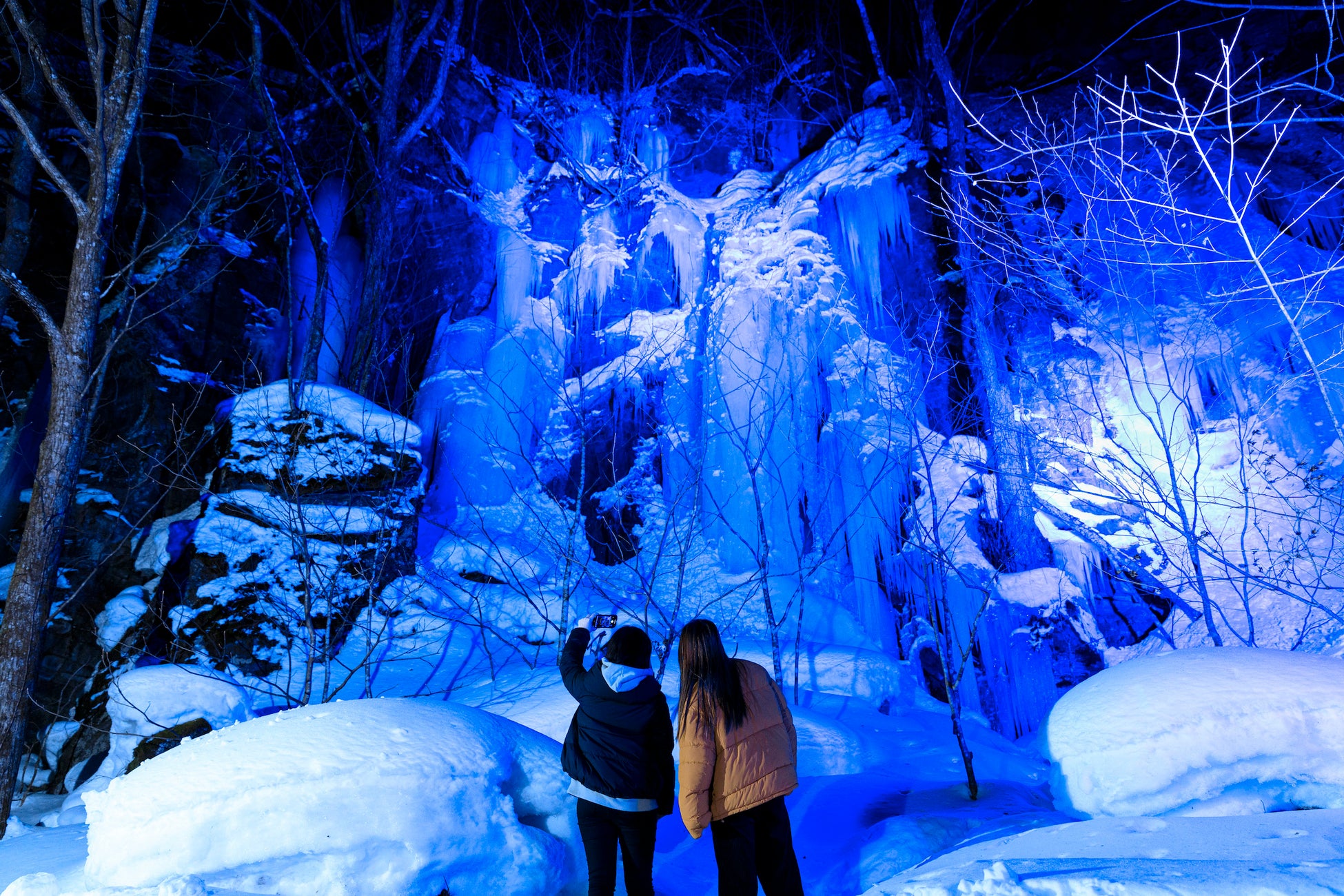 迫力満点な奥入瀬渓流の氷柱や氷瀑を、ネイチャーガイドの案内で訪ねる夜間のバスツアーです。渓流の名所で幻想的にライトアップされた氷雪の造形美を堪能できます。