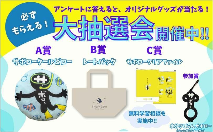 当日はアンケートに回答いただくと、夏と受験を乗り切る明光義塾のオリジナルグッズの抽選会に参加できます。さらに抽選会の参加者全員に、大人気の公式キャラクター「サボロー」のペットボトルホルダーをプレゼントします。