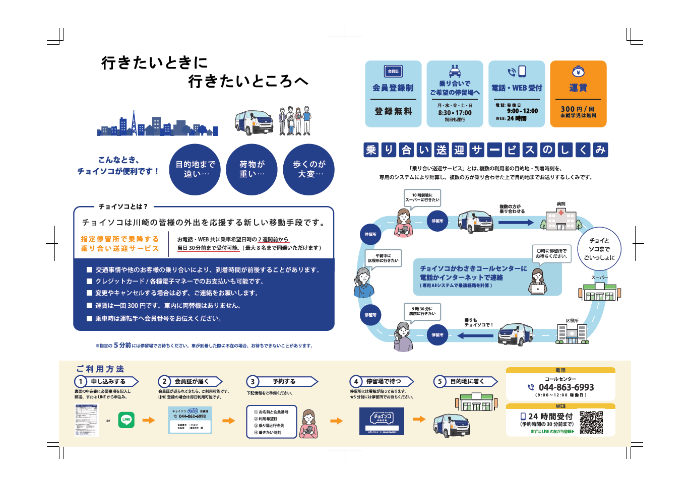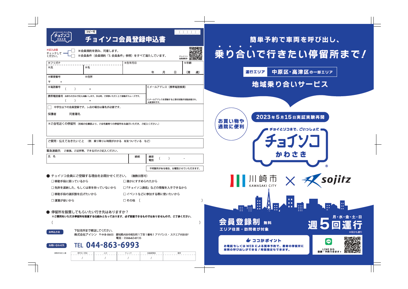 双日株式会社(以下「双日」)は、神奈川県川崎市における予約型デマンド交通サービス利用者からの実証実験再開を希望する声を受け、「チョイソコかわさき」事業として2023年5月15日より実証運行を再開します。