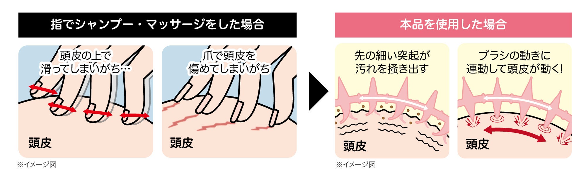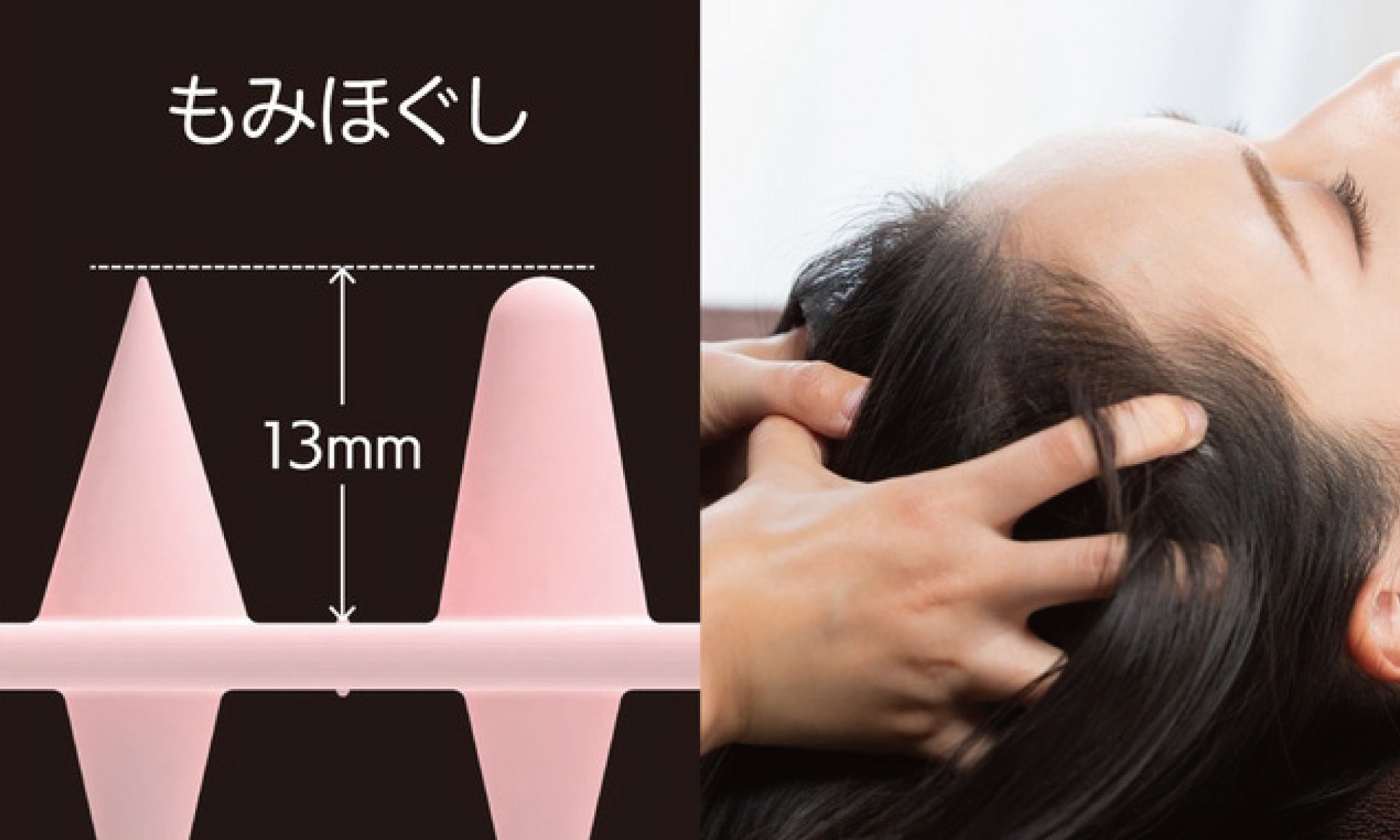 2種類の突起で頭皮を交互に刺激すると、頭皮の筋肉のこりをほぐし、血行を良くします。